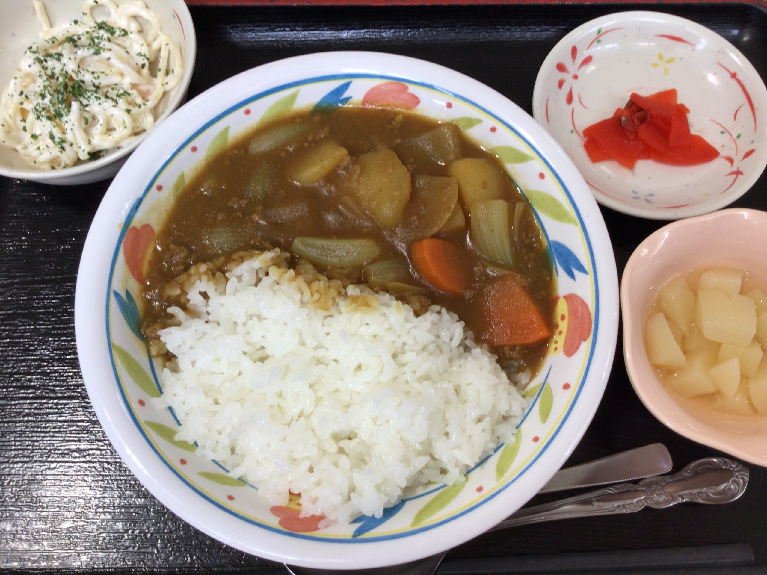【昼食】 1.カレーライス 2.福神漬け 3.スパゲティサラダ 4.フルーツ缶(白桃)