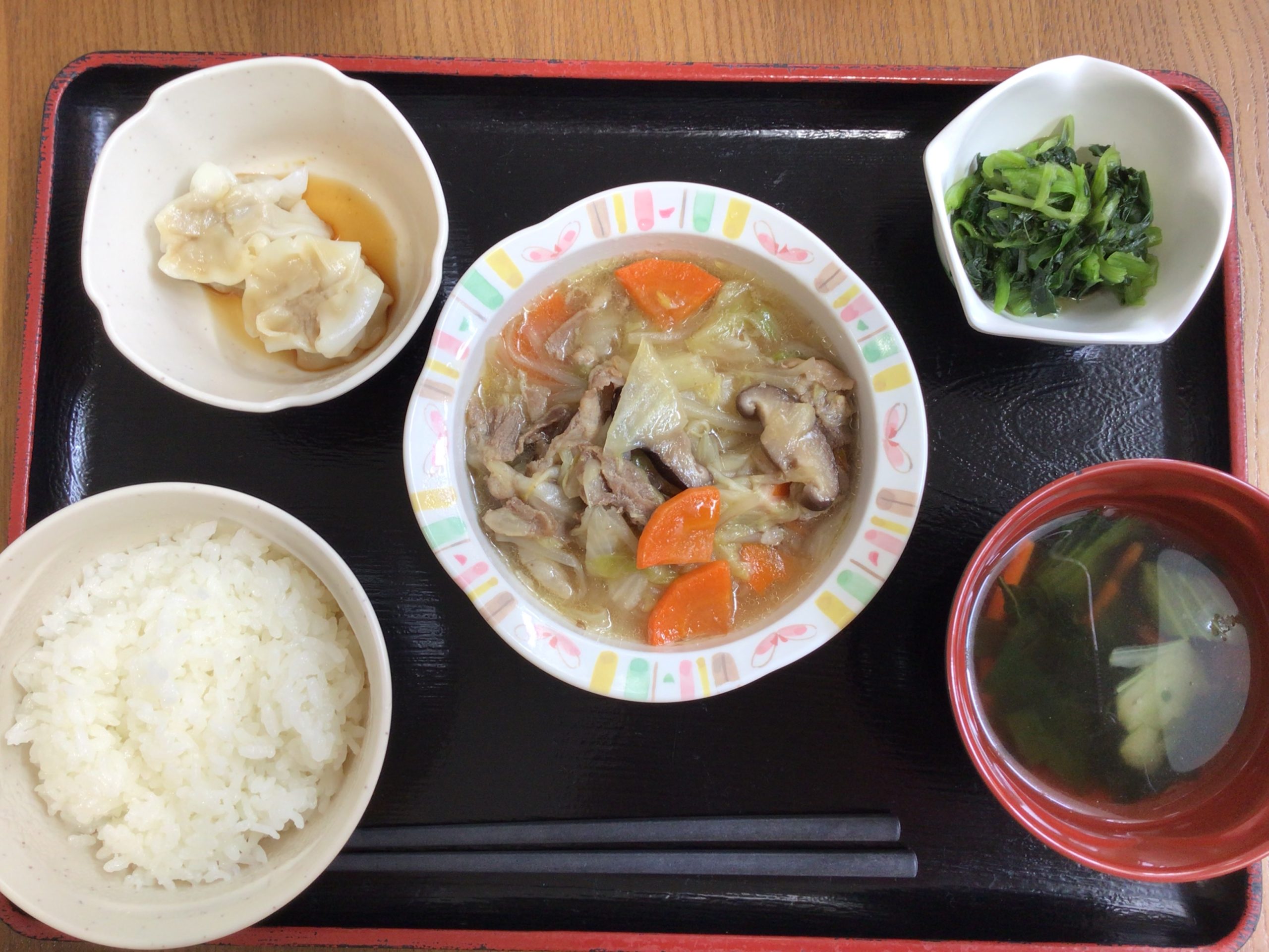 【昼食】 1.ご飯 2.八宝菜 3.ナムル 4.蒸しシューマイ 5.中華風スープ