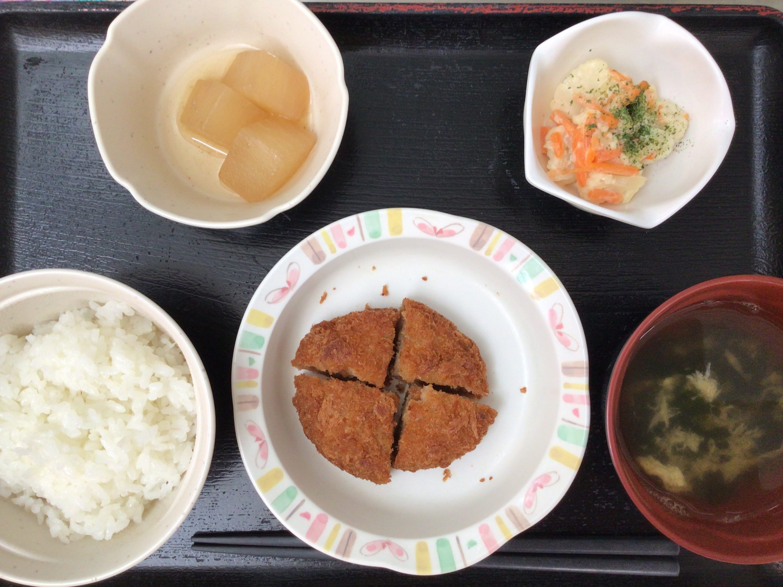 【昼食】 1.米飯 2.ミンチカツ 3.カリフラワーマヨネーズあえ 4.大根煮物 5.すまし汁