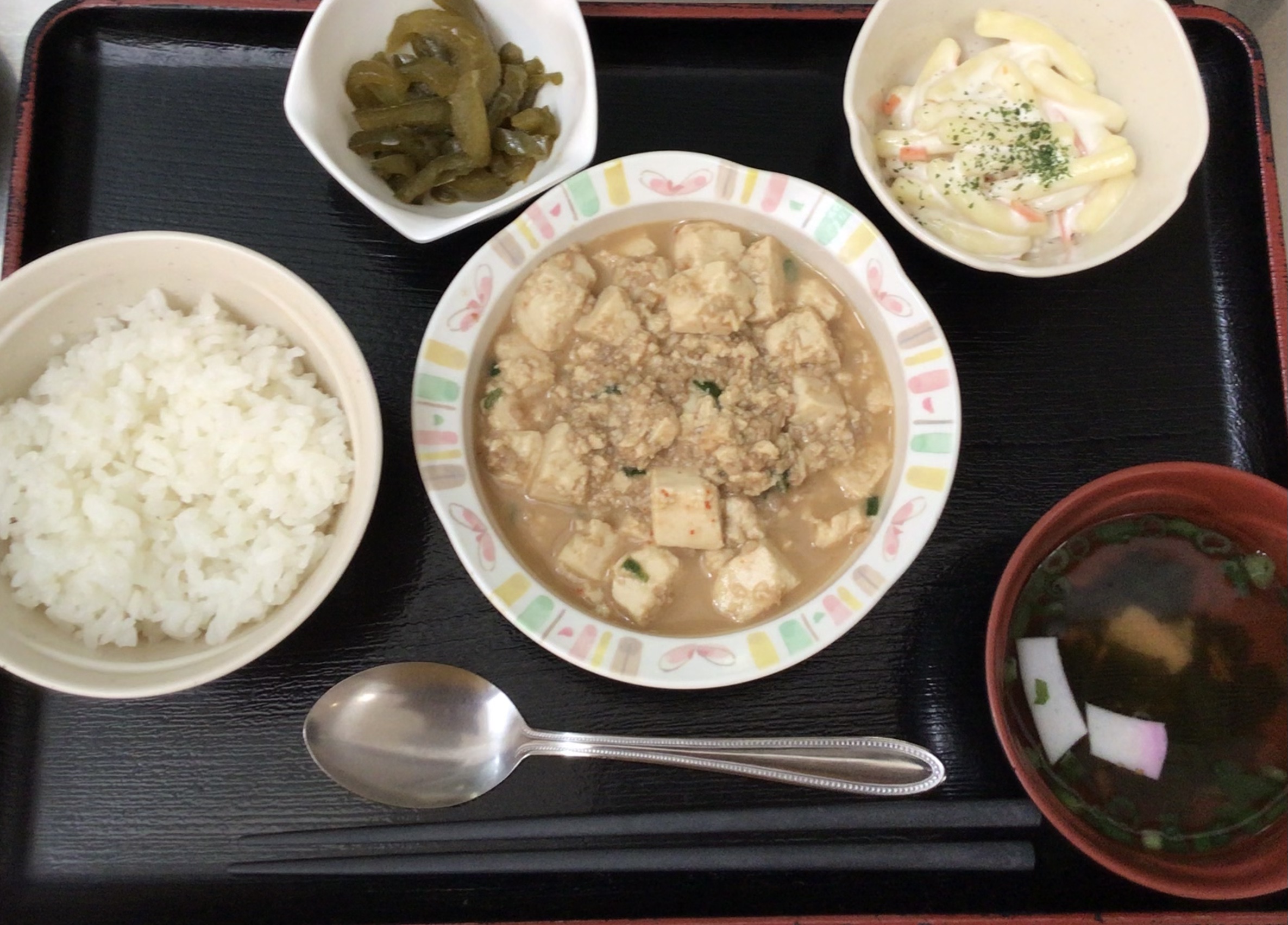 【昼食】 1.米飯 2.麻婆豆腐 3.マカロニサラダ 4.ピーマン甘辛煮 5.すまし汁