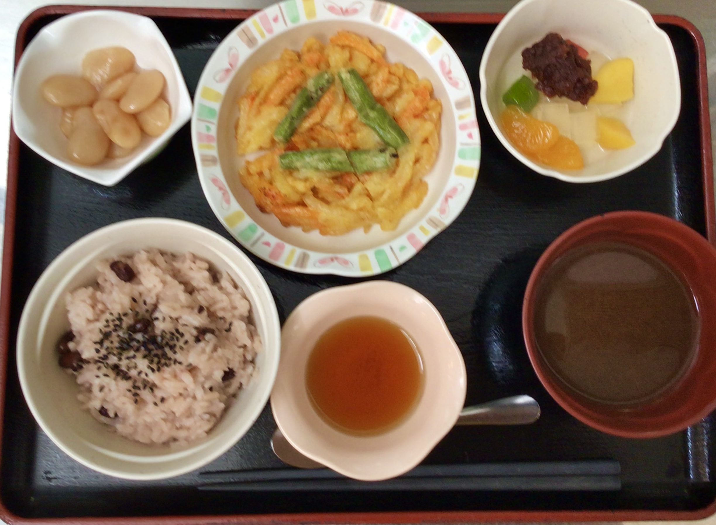 【昼食】 1.赤飯 2.かき揚げ 3.白花豆 4.赤だし 5.フルーツあんみつ