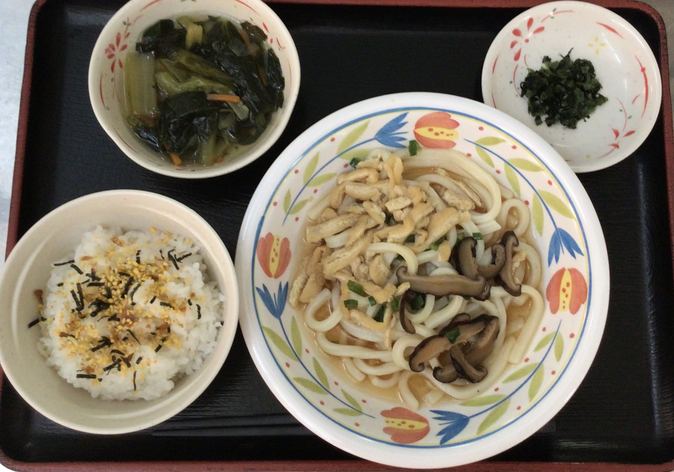 【昼食】 1.ふりかけご飯 2.冷やしうどん 3.小松菜煮浸し 4.漬物