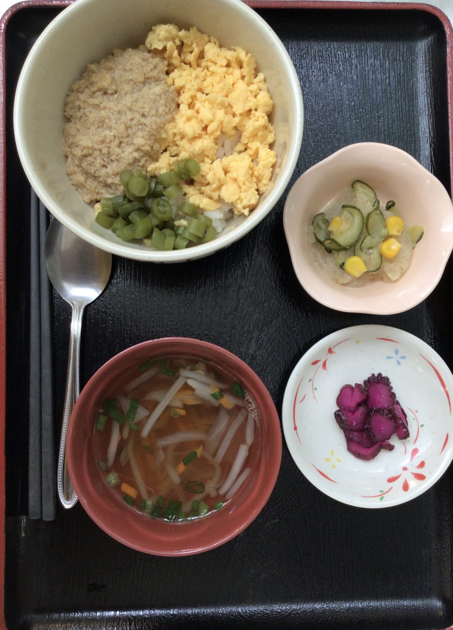 【昼食】 1.三色そぼろ丼 2.大根サラダ 3.漬物 4.すまし汁