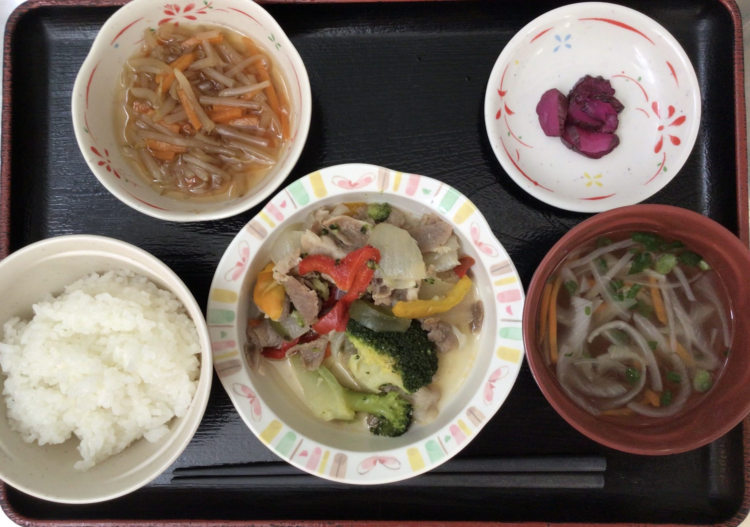 【昼食】 1.米飯 2.豚のねぎ塩炒め 3.もやしのさっと煮 4.漬物 5.すまし汁