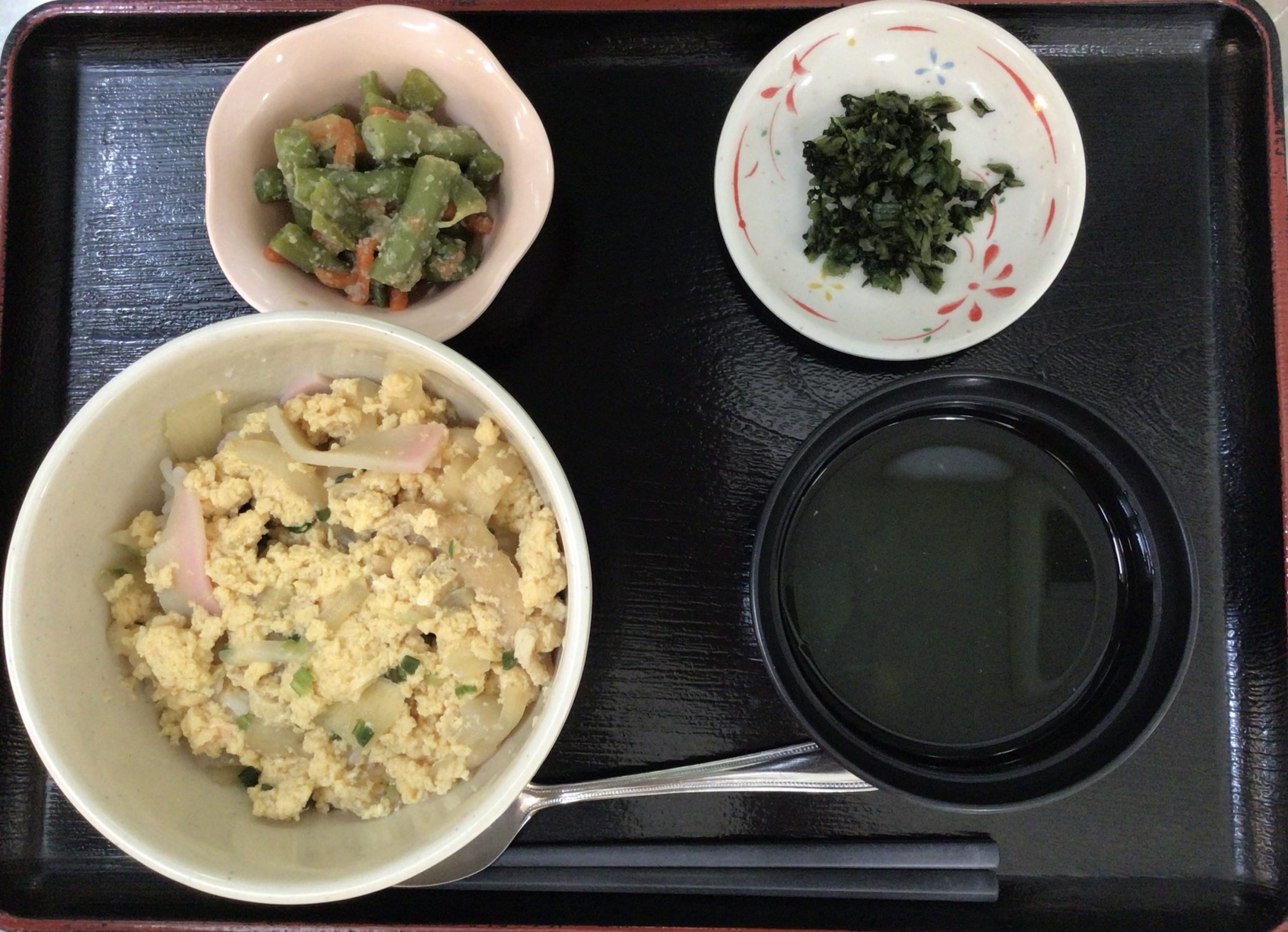 【昼食】 1.木の葉丼 2.いんげんごま味噌和え 3.漬物 4.すまし汁