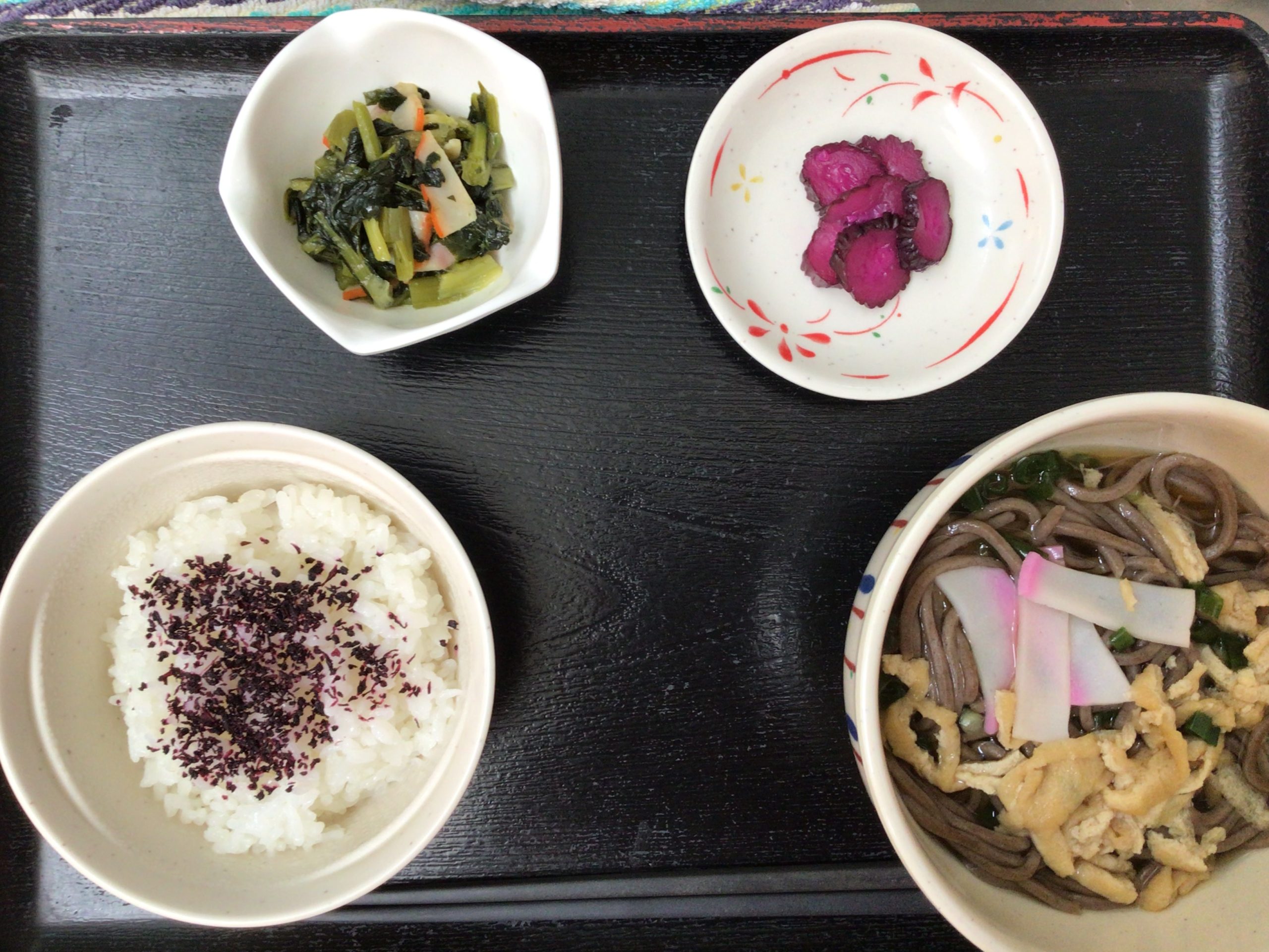 【昼食】 1.ゆかりご飯 2.きざみそば 3.小松菜炒め 4.漬物