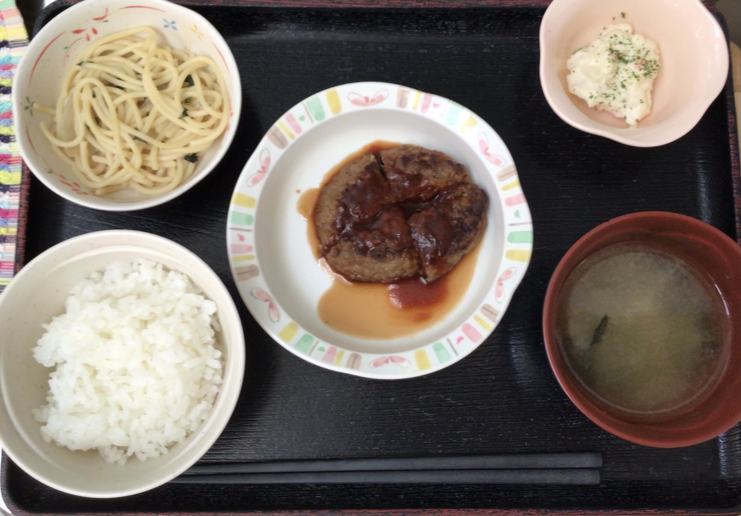 【昼食】 1.米飯 2.ハンバーグ(ケチャップ) 3.ポテトサラダ 4.青じそスパゲティ 5.みそ汁