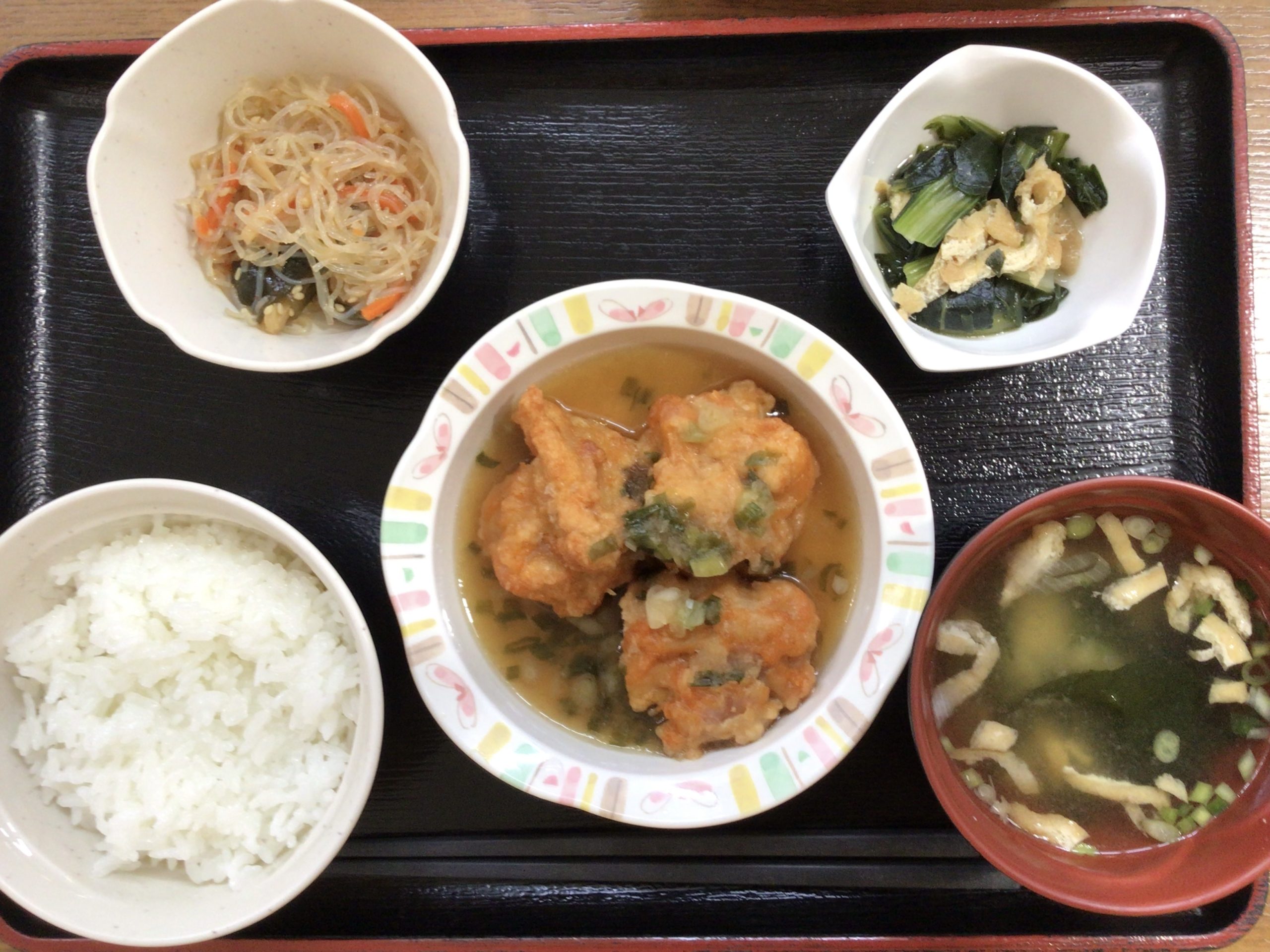 【昼食】 1.ご飯 2.鶏の揚げおろし煮 3.中華春雨サラダ 4.青梗菜の煮びたし 5.みそ汁