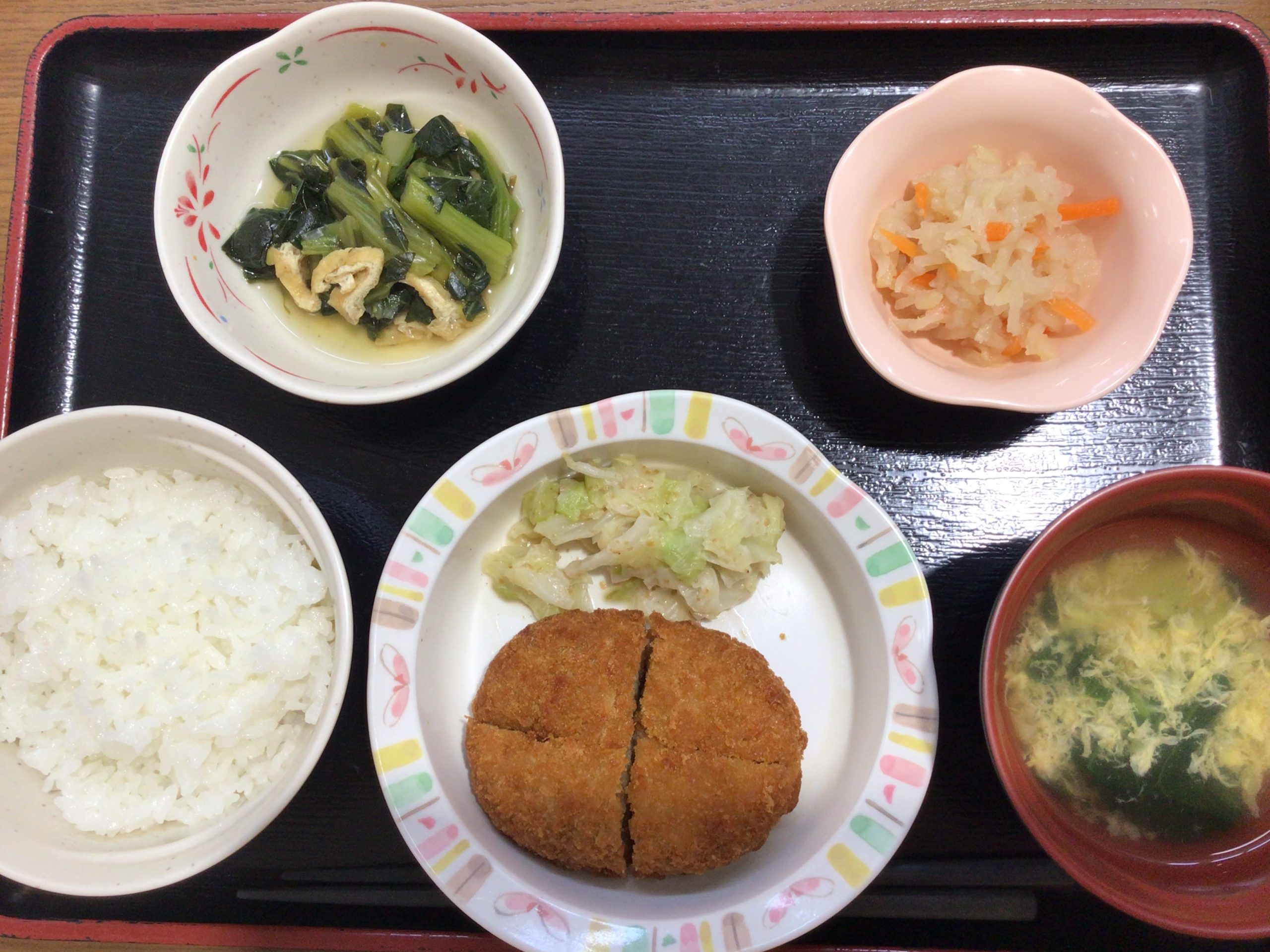 【昼食】 1.ご飯 2.コロッケ ボイルキャベツ添え 3.小松菜煮浸し 4.なます 5.すまし汁