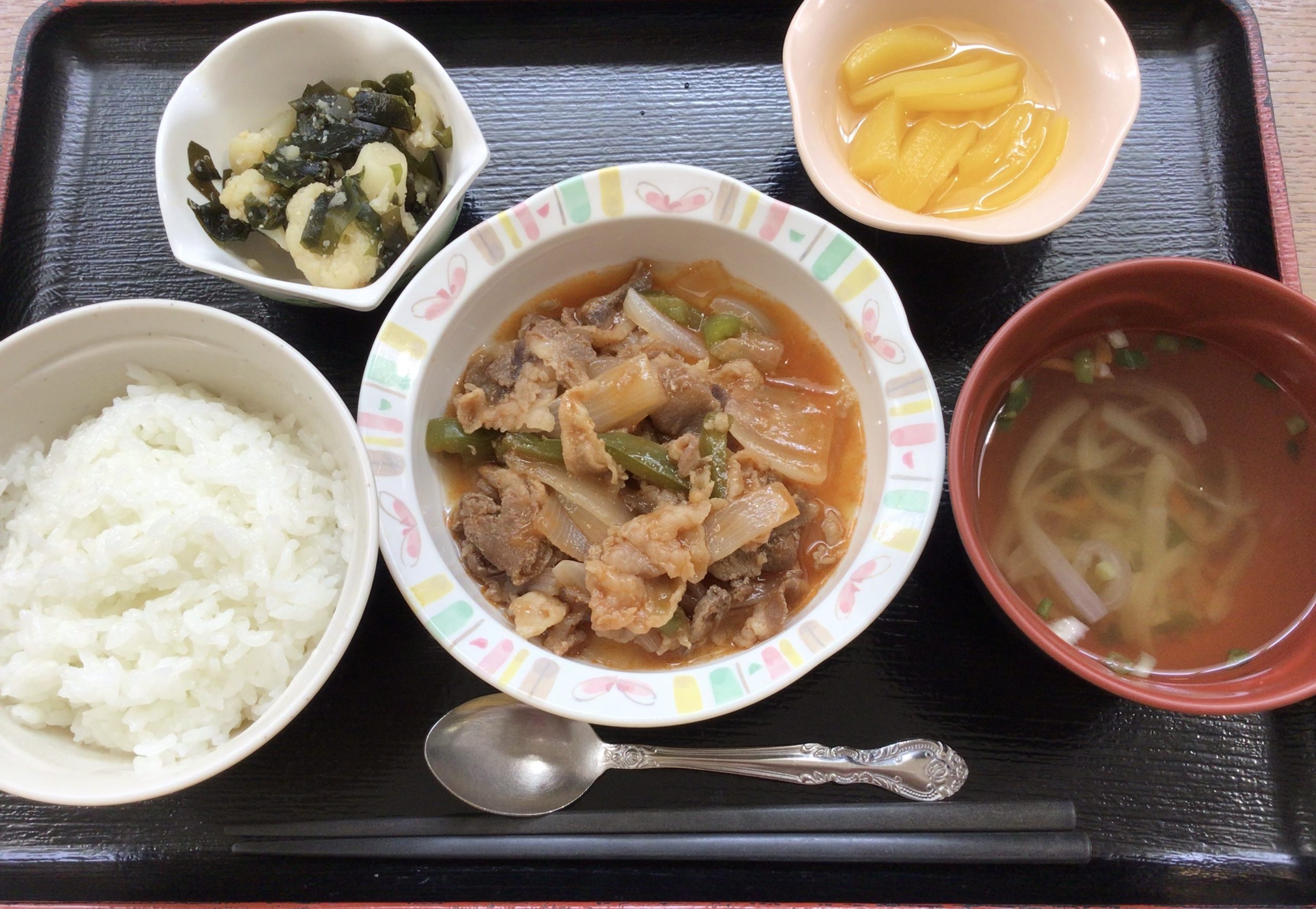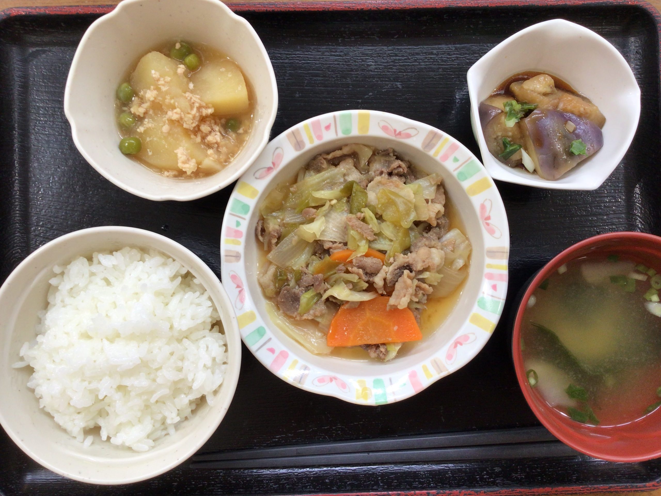 【昼食】 1.ご飯 2.野菜炒め 3.じゃがいものそぼろ煮 4.揚げ茄子ポン酢和え 5.みそ汁