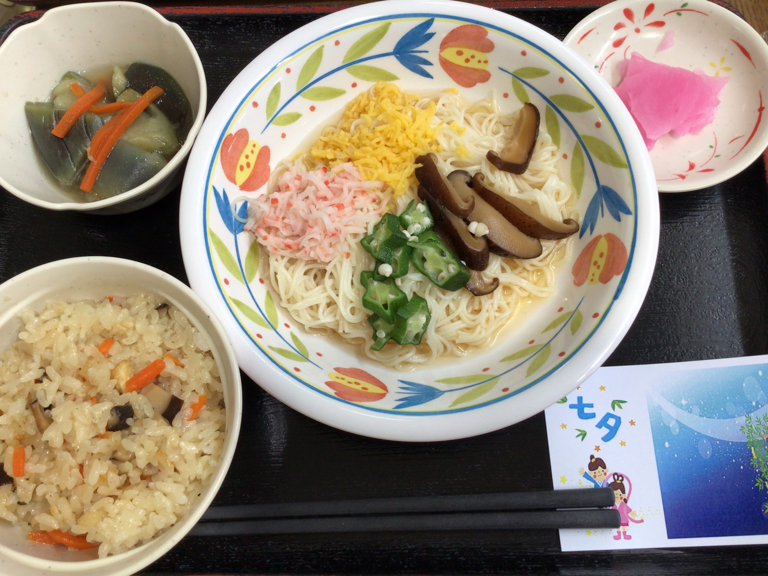 【昼食】 1.炊き込みご飯(小) 2.七夕そうめん 3.茄子の煮物 4.漬物