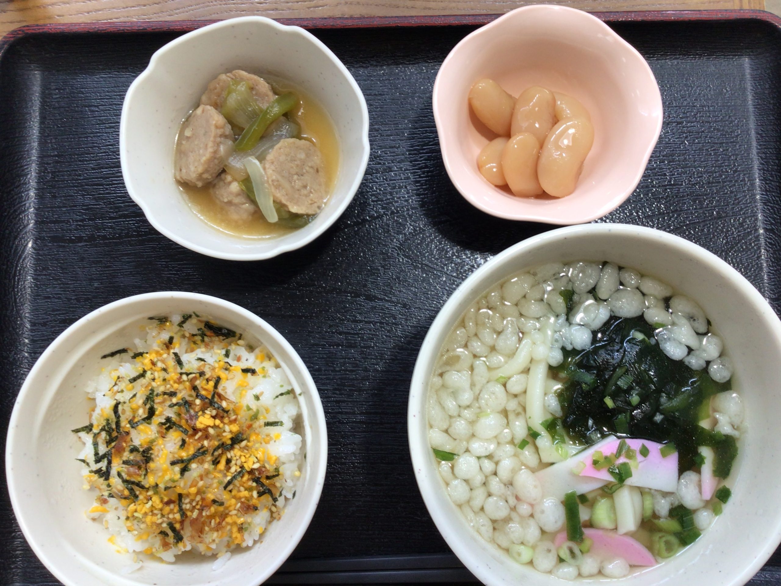 【昼食】 1.ふりかけご飯(小) 2.わかめうどん 3.肉団子甘煮 4.白花豆