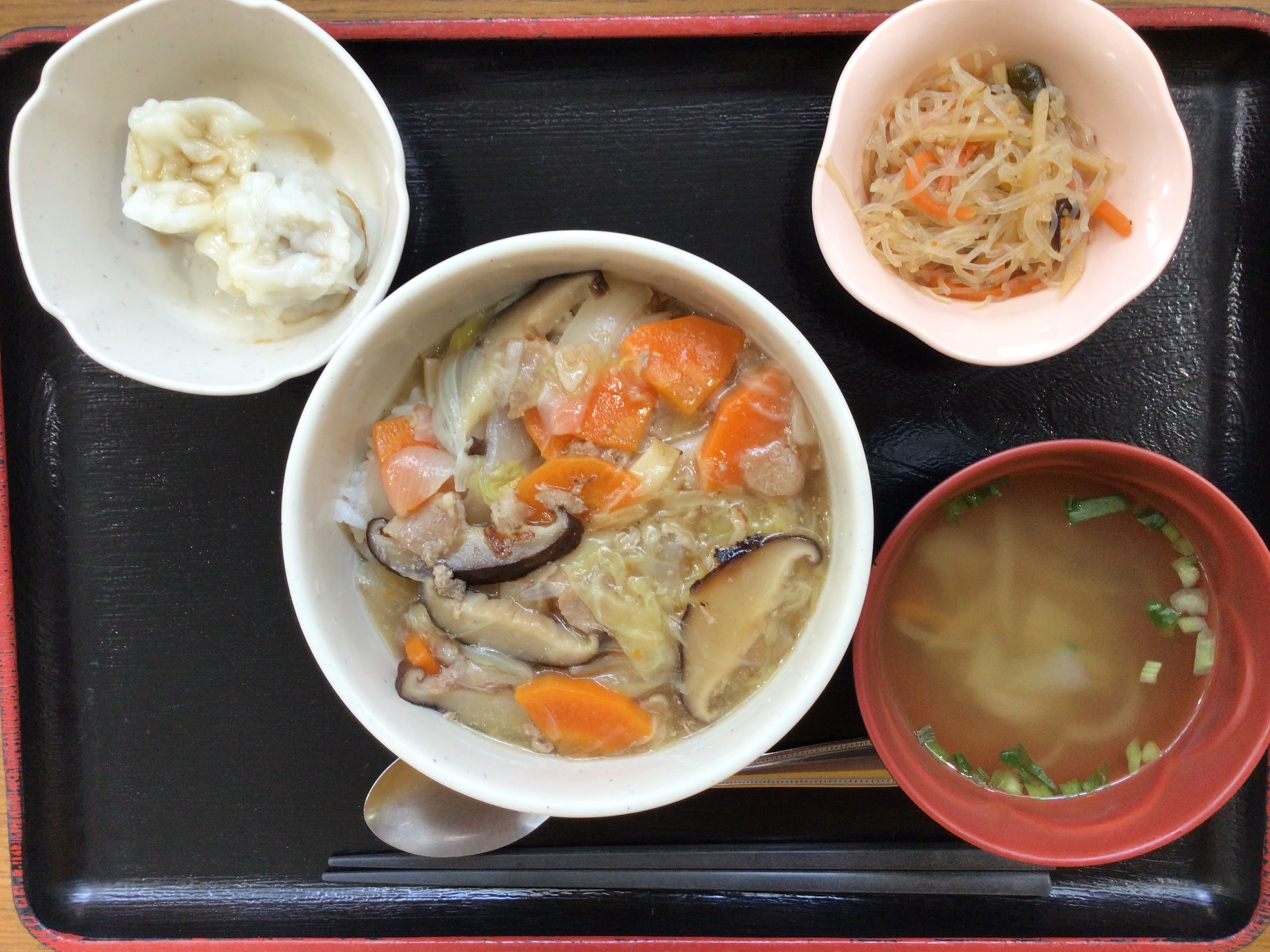 【昼食】 1.中華丼 2.蒸しシューマイ 3.春雨中華サラダ 4.中華風スープ