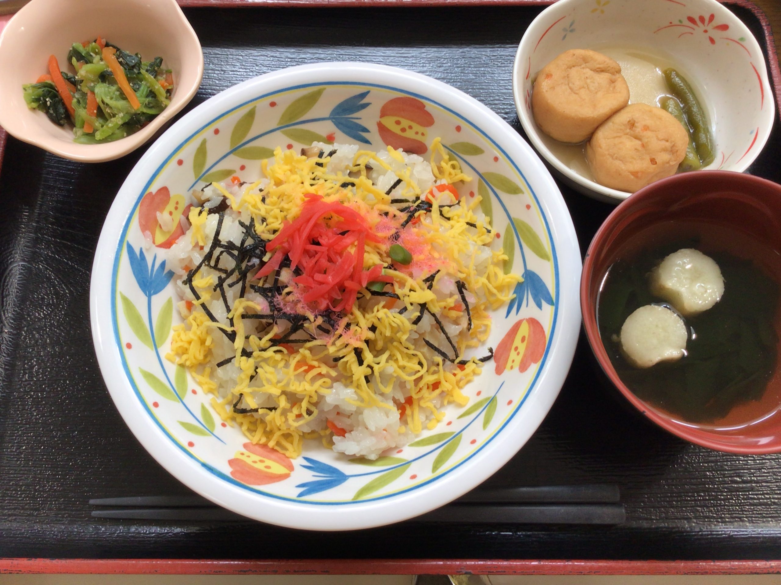 【昼食】 1.五目ちらし寿司 2.がんもの含め煮 3.小松菜ごま和え 4.すまし汁
