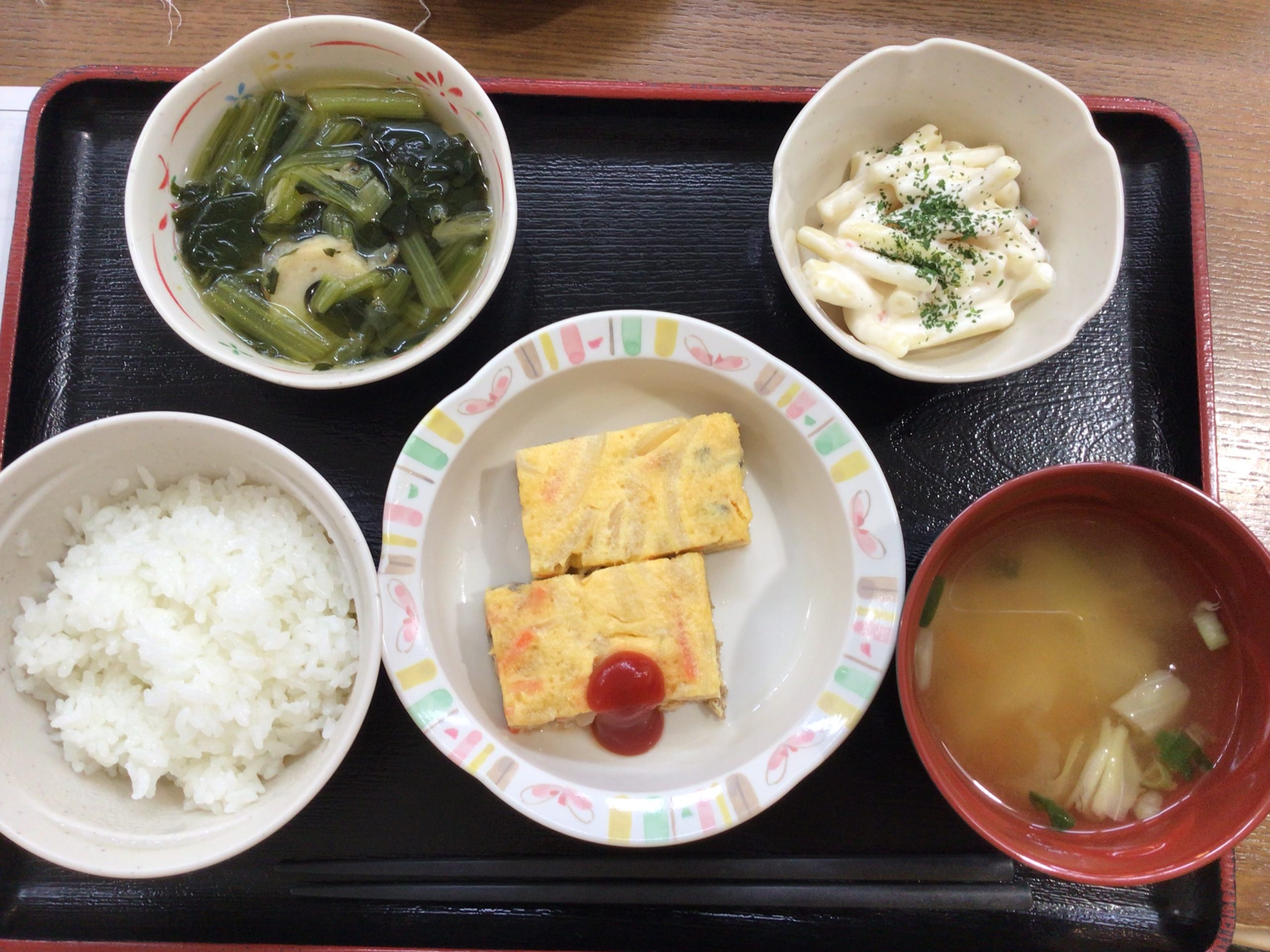 【昼食】 1.ご飯 2.オムレツ 3.小松菜の煮びたし 4.マカロニサラダ 5.みそ汁