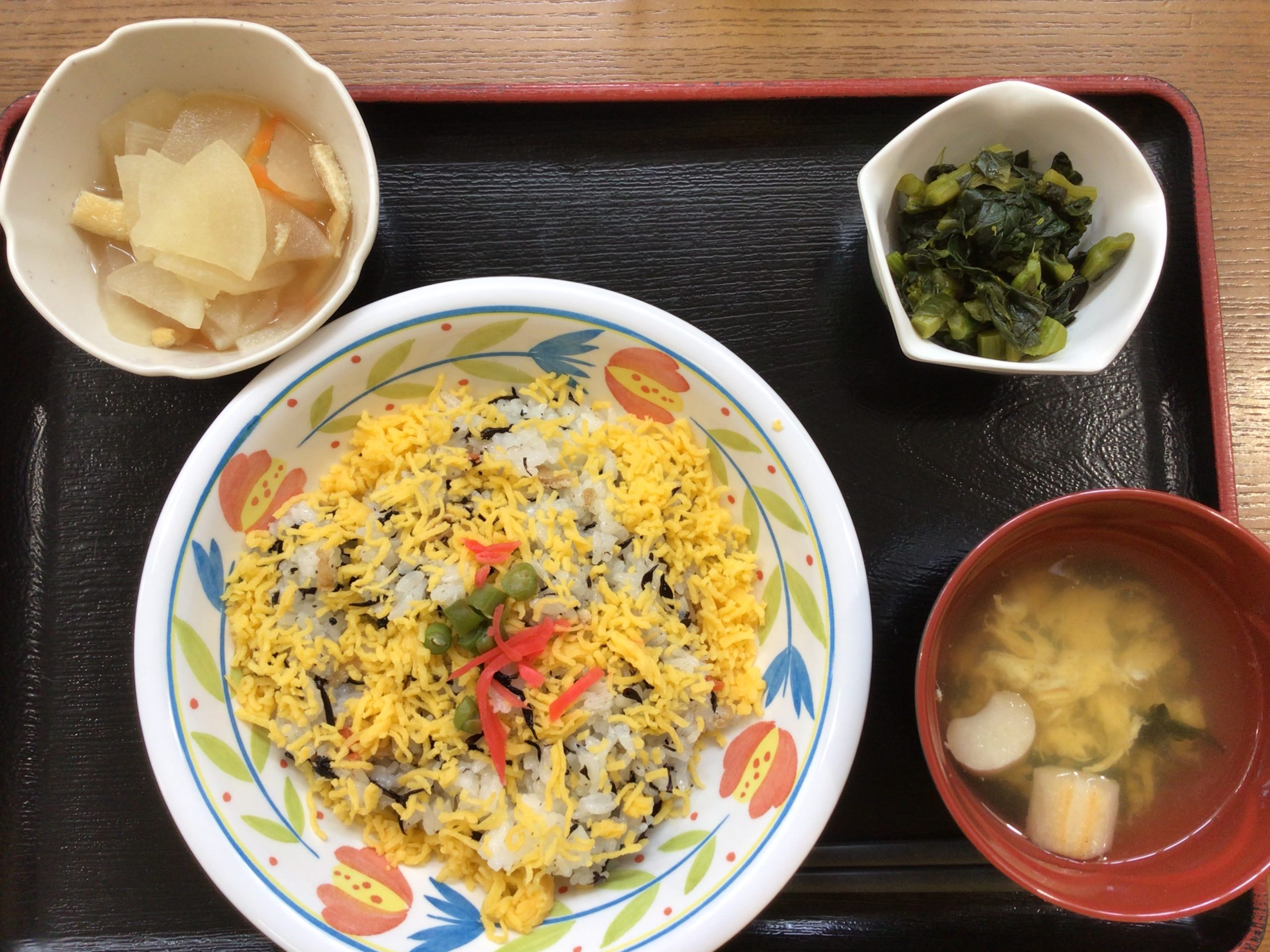 【昼食】 1.ひじきチラシ寿司 2.大根の煮物 3.菜の花のゆず和え 4.すまし汁