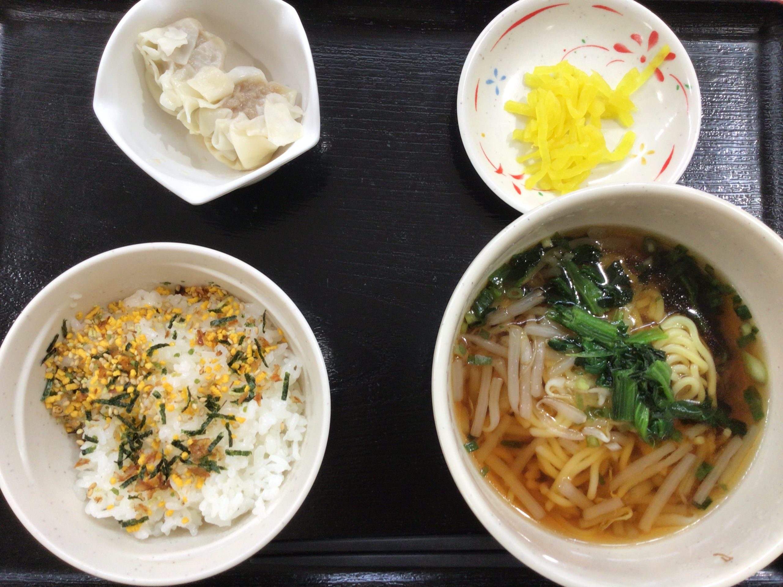 【昼食】 1.ふりかけご飯(小) 2.醤油ラーメン 3.蒸しシューマイ 4.漬物