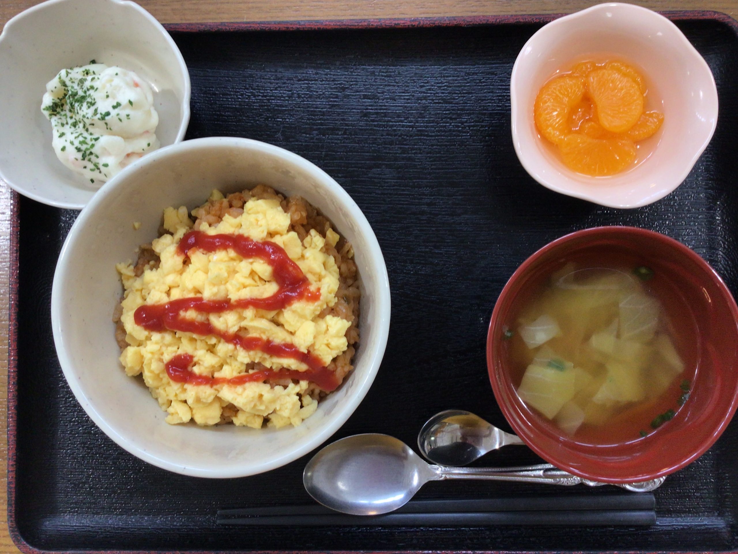 【昼食】 1.オム丼 2.ポテトサラダ 3.みかん缶 4.コンソメスープ
