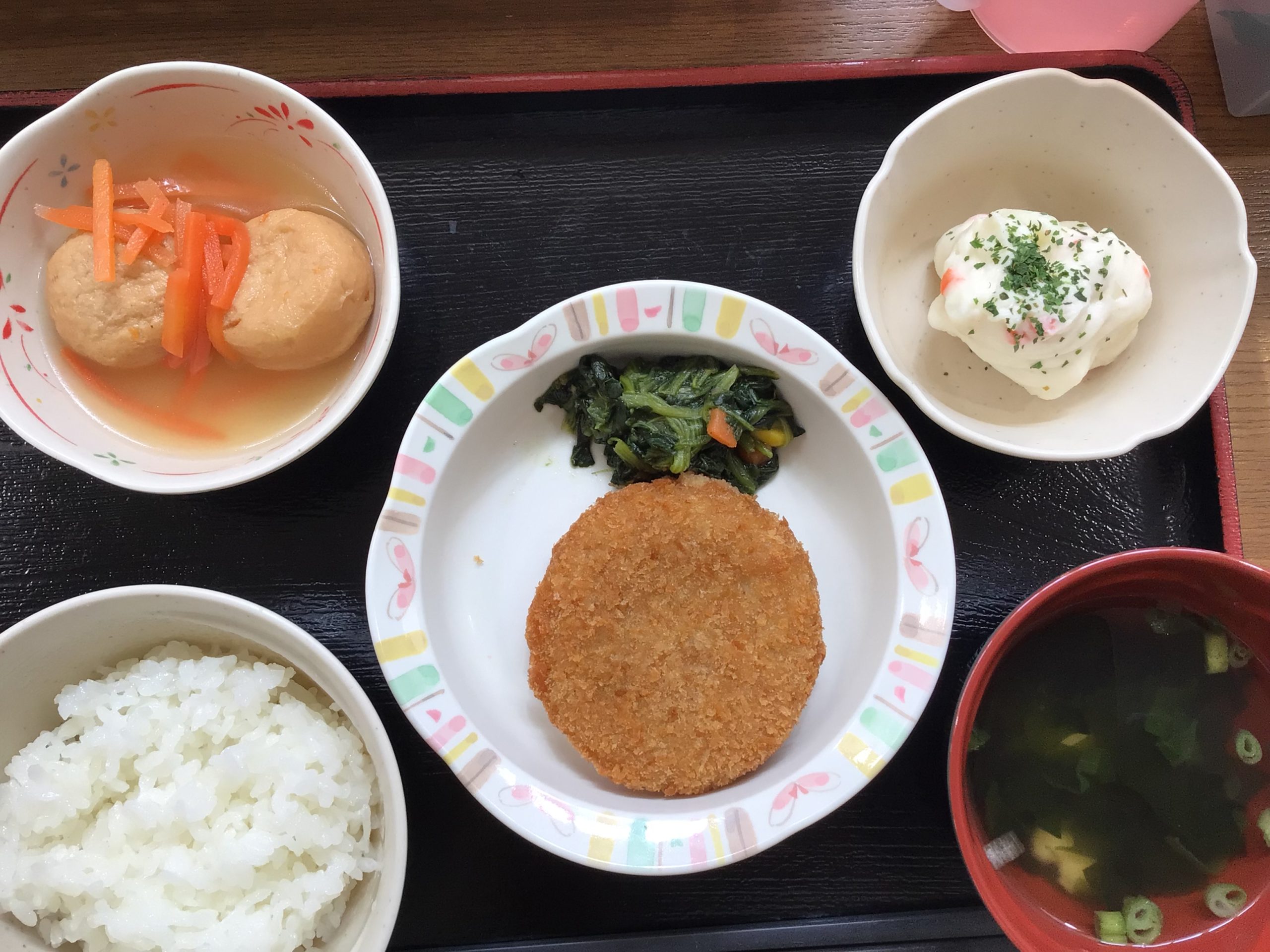 【昼食】 1.ご飯 2.メンチカツ(添)ほうれん草ドレッシング和え 3.がんもの含め煮 4.ポテトサラダ 5.すまし汁