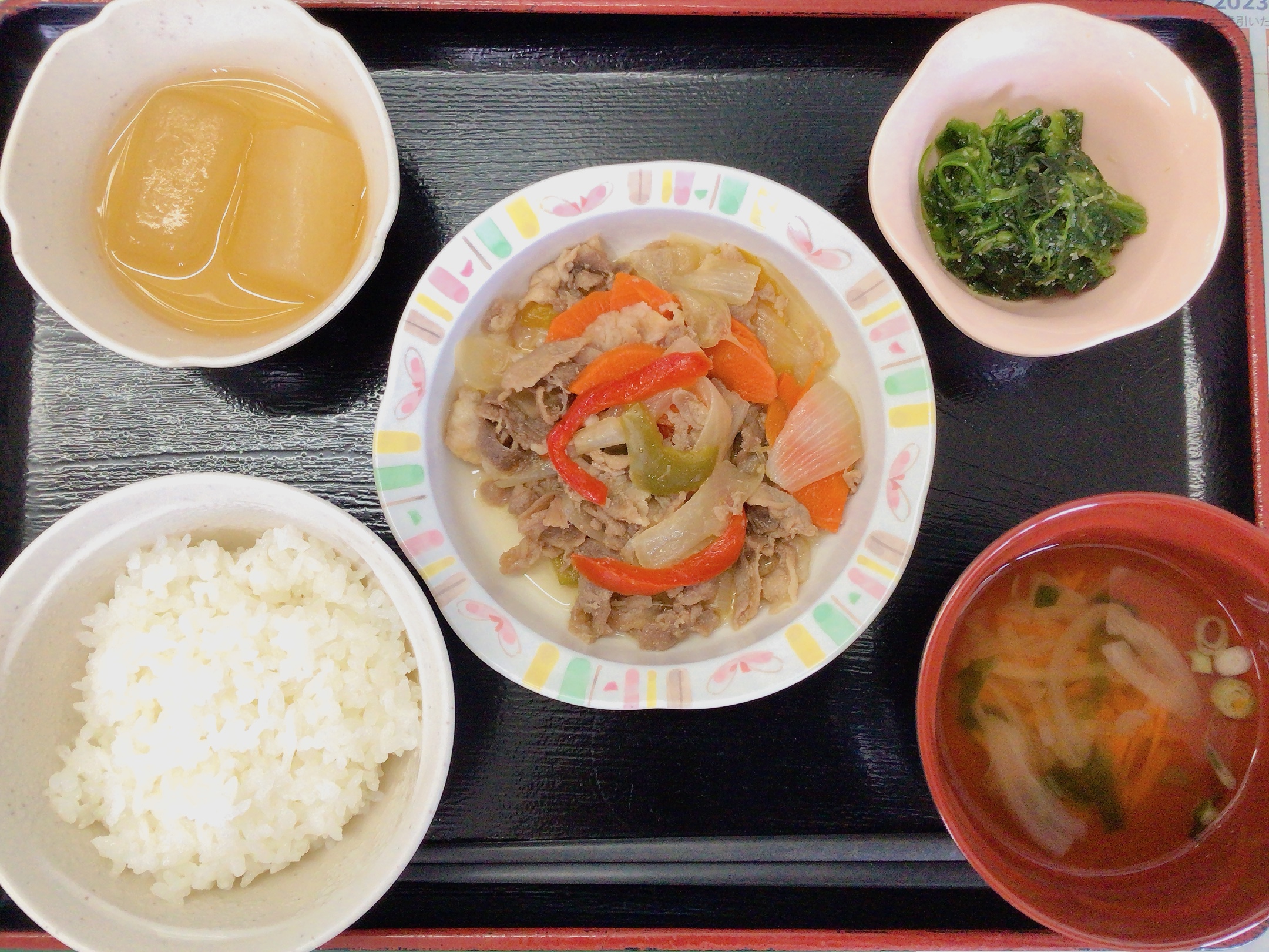 【昼食】 1.ご飯 2.豚肉の生姜炒め 3.冬瓜の煮物 4.ほうれん草のごま和え 5.すまし汁