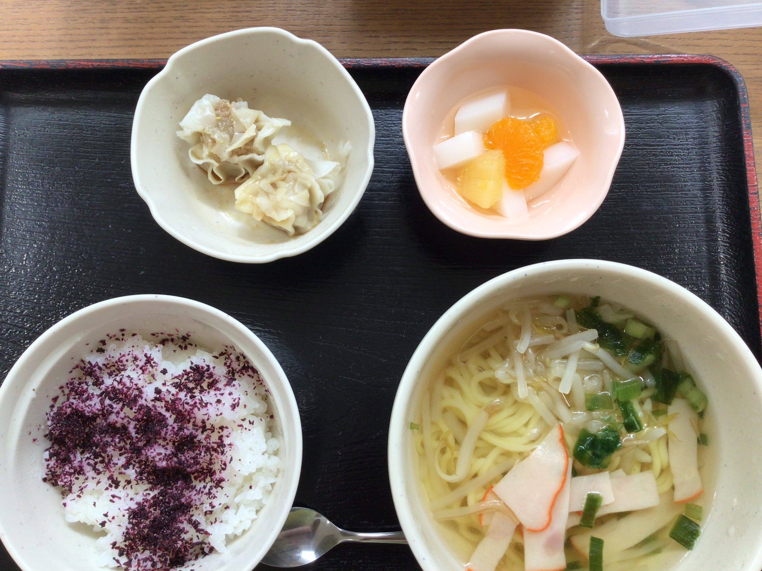 【昼食】 1.ゆかりご飯(小) 2.塩ラーメン 3.蒸しシューマイ 4.フルーツ杏仁豆腐