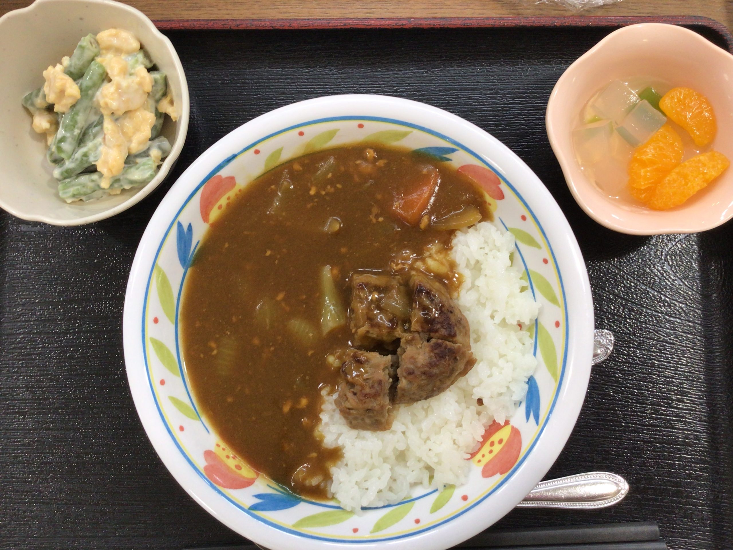 【昼食】 1.ハンバーグカレー 2.いんげんのツナマヨ和え 3.フルーツ寒天