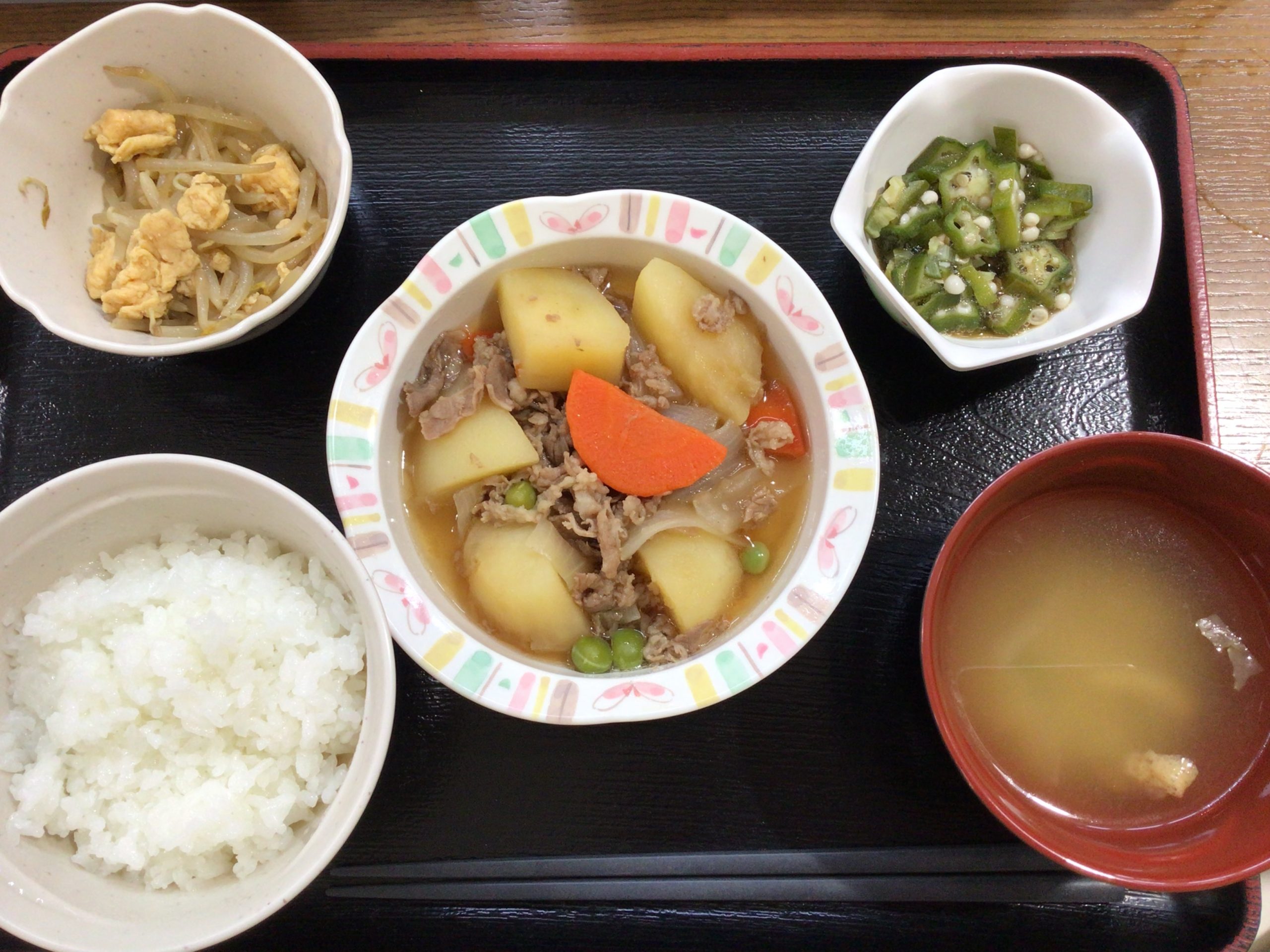 【昼食】 1.ご飯 2.肉じゃが 3.もやしと卵の炒め物 4.オクラのポン酢和え 5.みそ汁