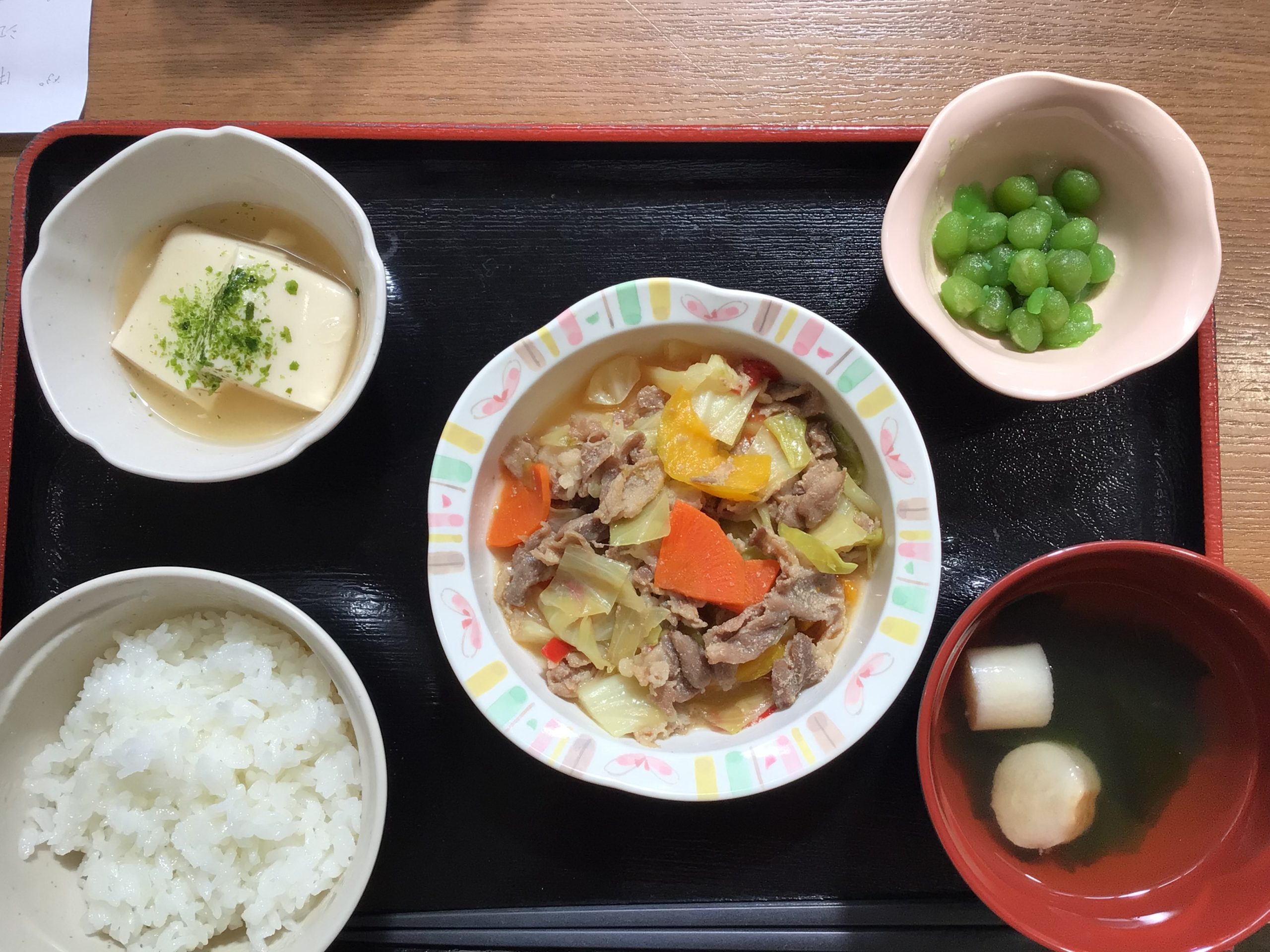 【昼食】 1.ご飯 2.豚とキャベツの味噌炒め 3.煮奴 4.うぐいす豆 5.すまし汁