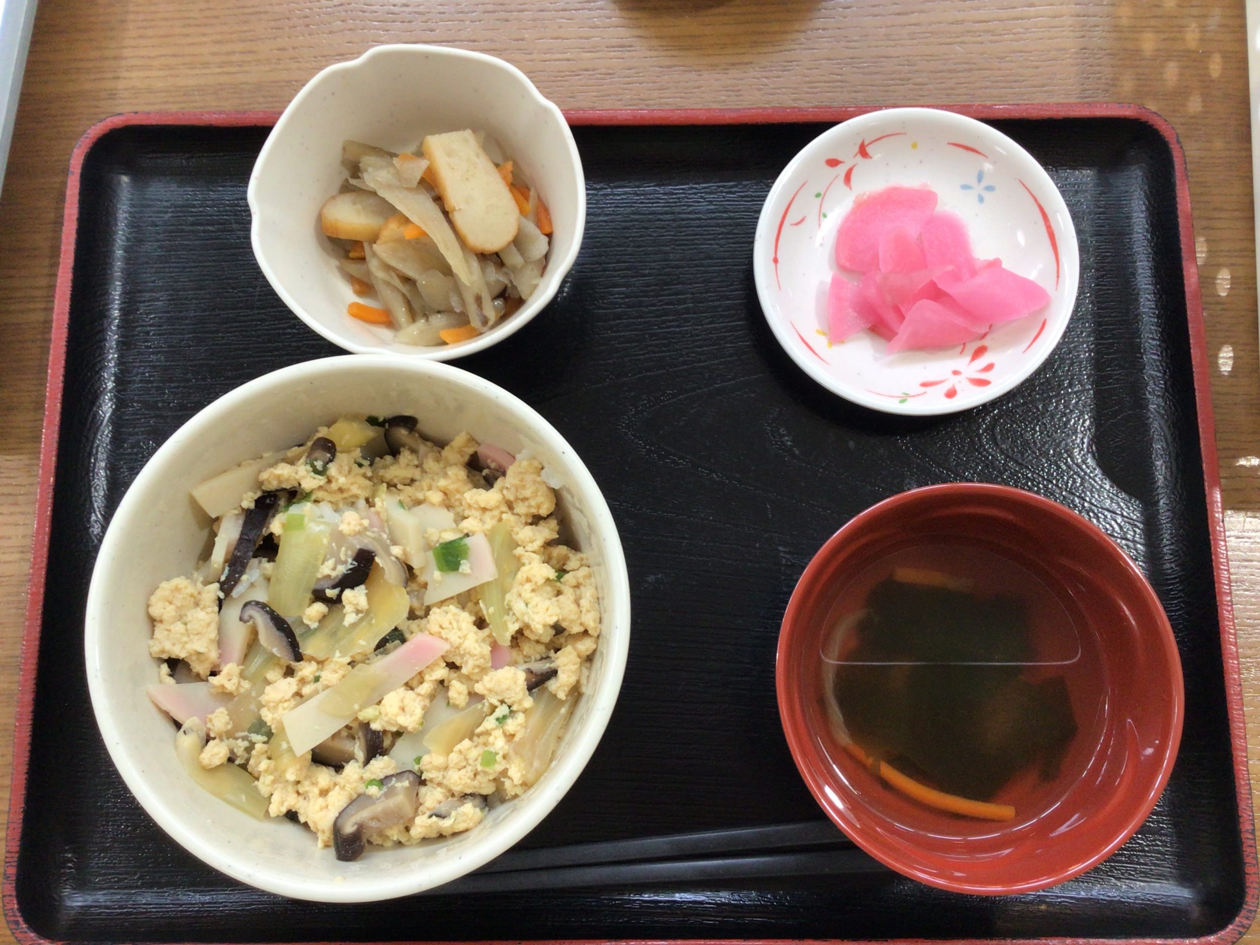 【昼食】 1.木の葉丼 2.きんぴらごぼう 3.漬物 4.すまし汁