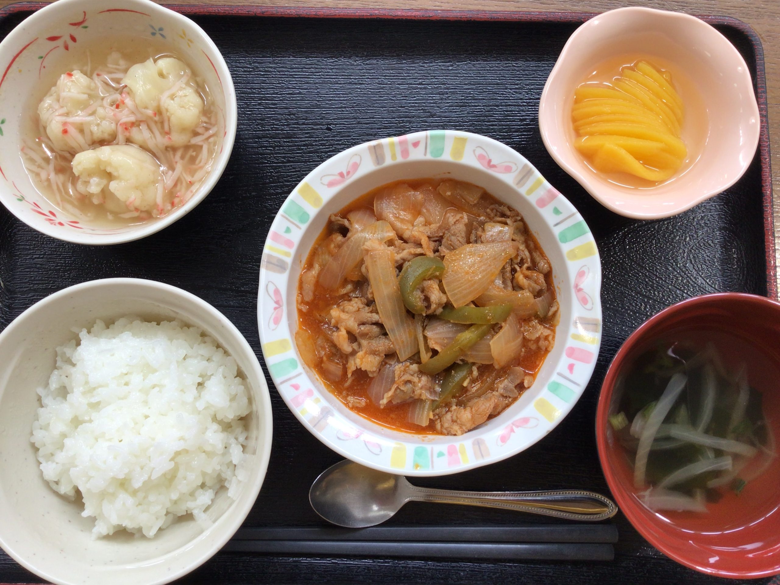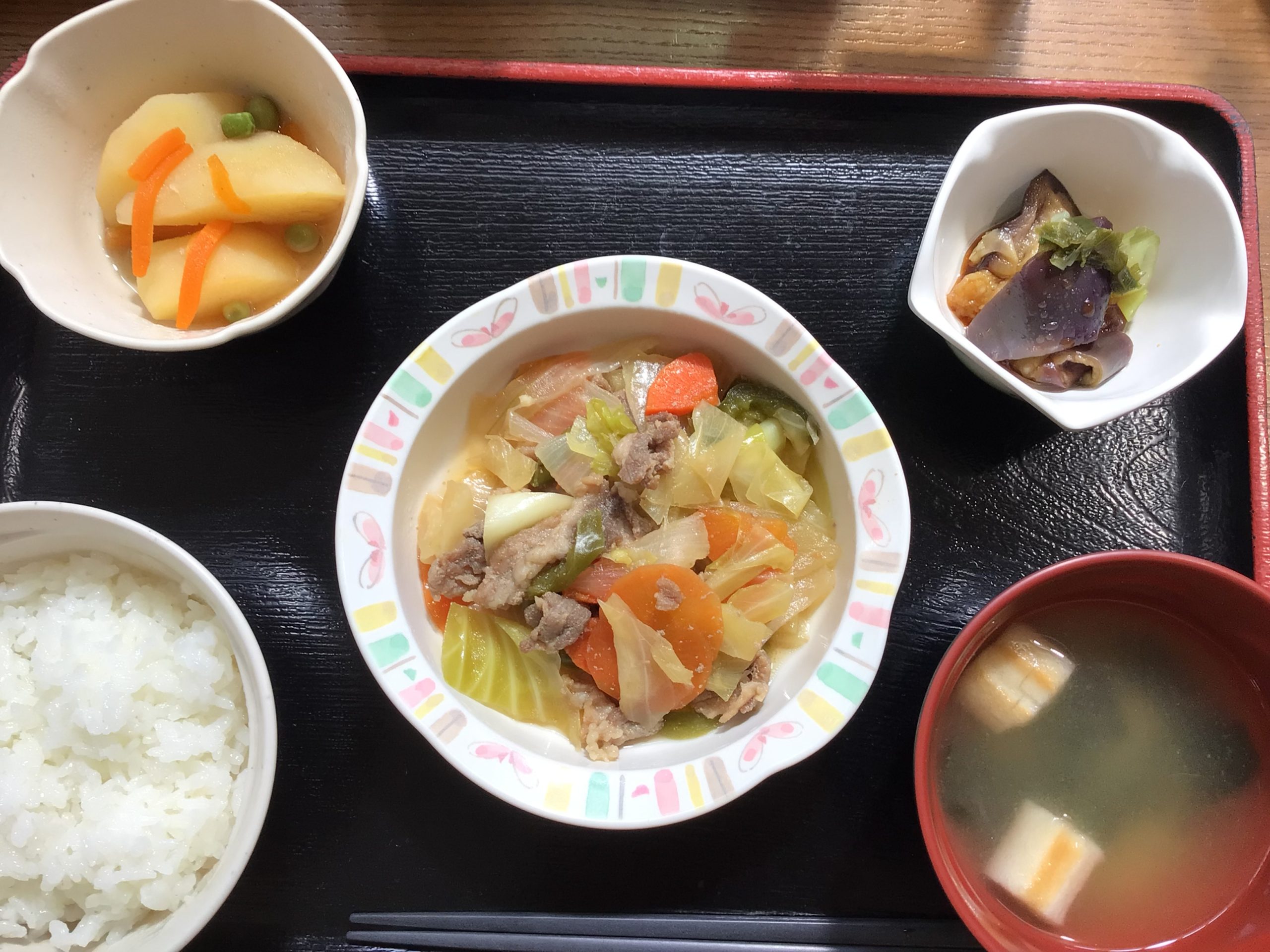 【昼食】 1.ご飯 2.肉野菜炒め 3.じゃがいもの煮物 4.揚げ茄子ポン酢和え 5.みそ汁