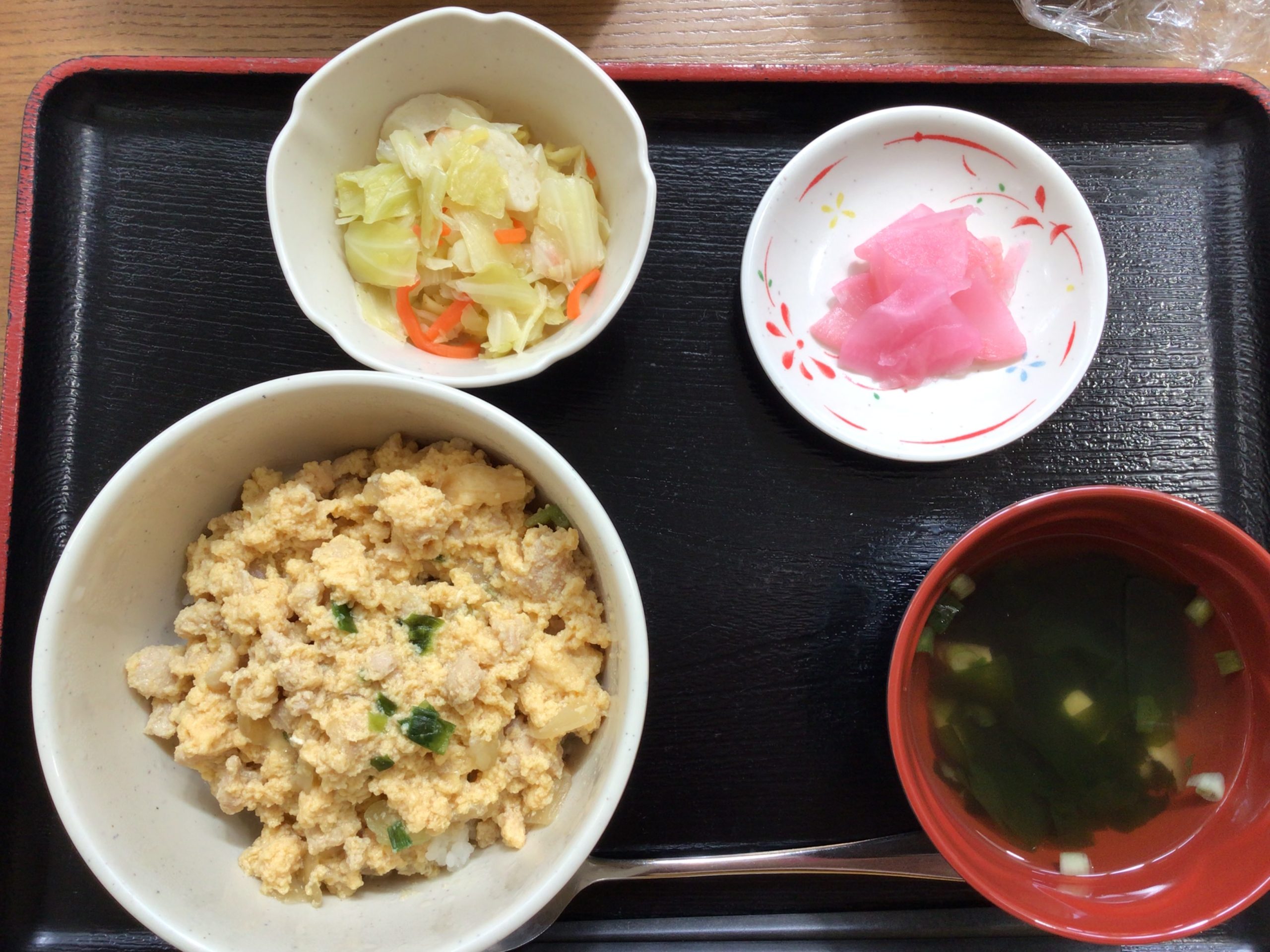 【昼食】 1.親子丼 2.キャベツのさっぱり和え 3.漬物 4.すまし汁