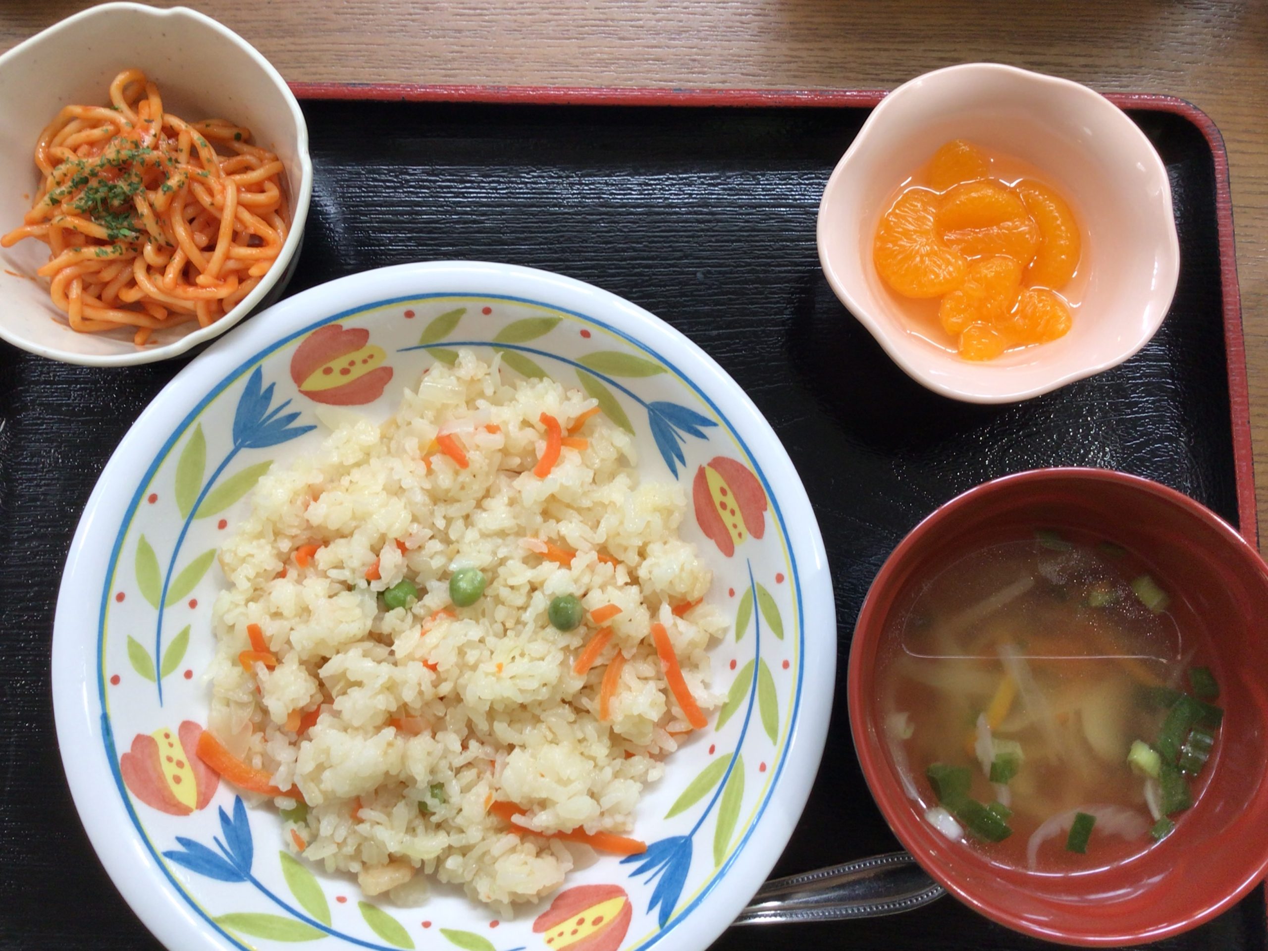 【昼食】 1.炊き込みピラフ 2.ナポリタン 3.フルーツ缶(みかん) 5.コンソメスープ
