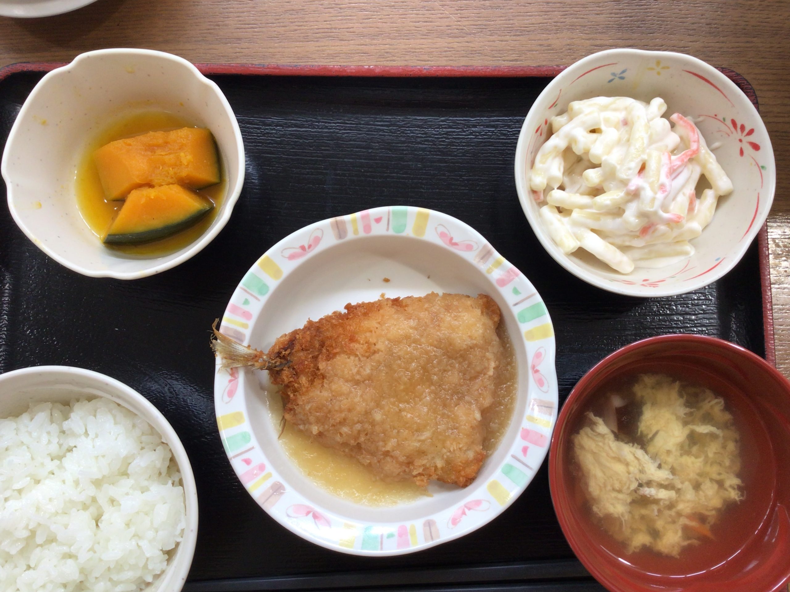 【昼食】 1.ご飯 2.あじフライのみぞれかけ 3.かぼちゃ煮 4.マカロニサラダ 5.すまし汁