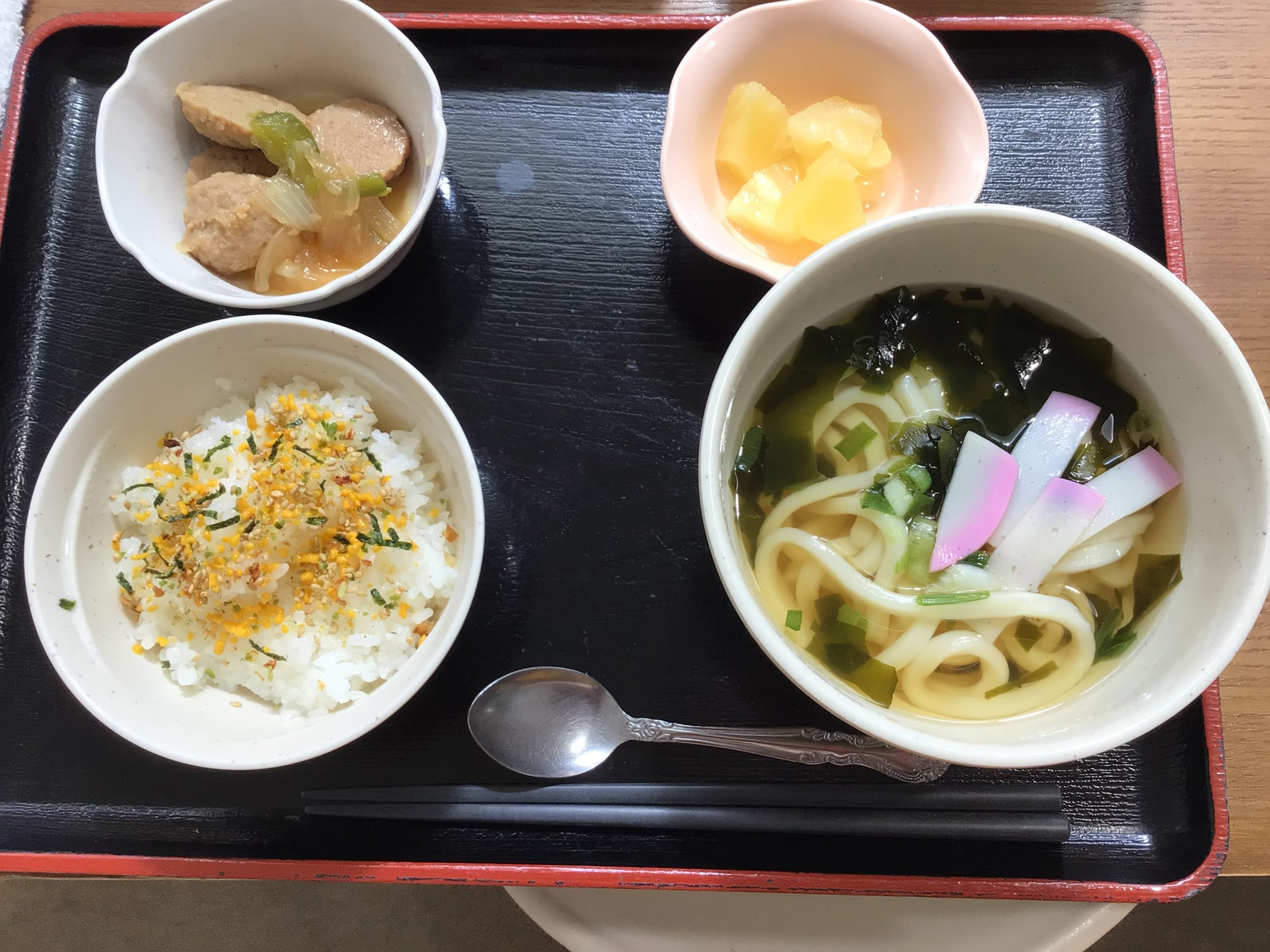 【昼食】 1.ふりかけご飯(小) 2.わかめうどん 3.肉団子甘煮 4.フルーツ缶(パイン)