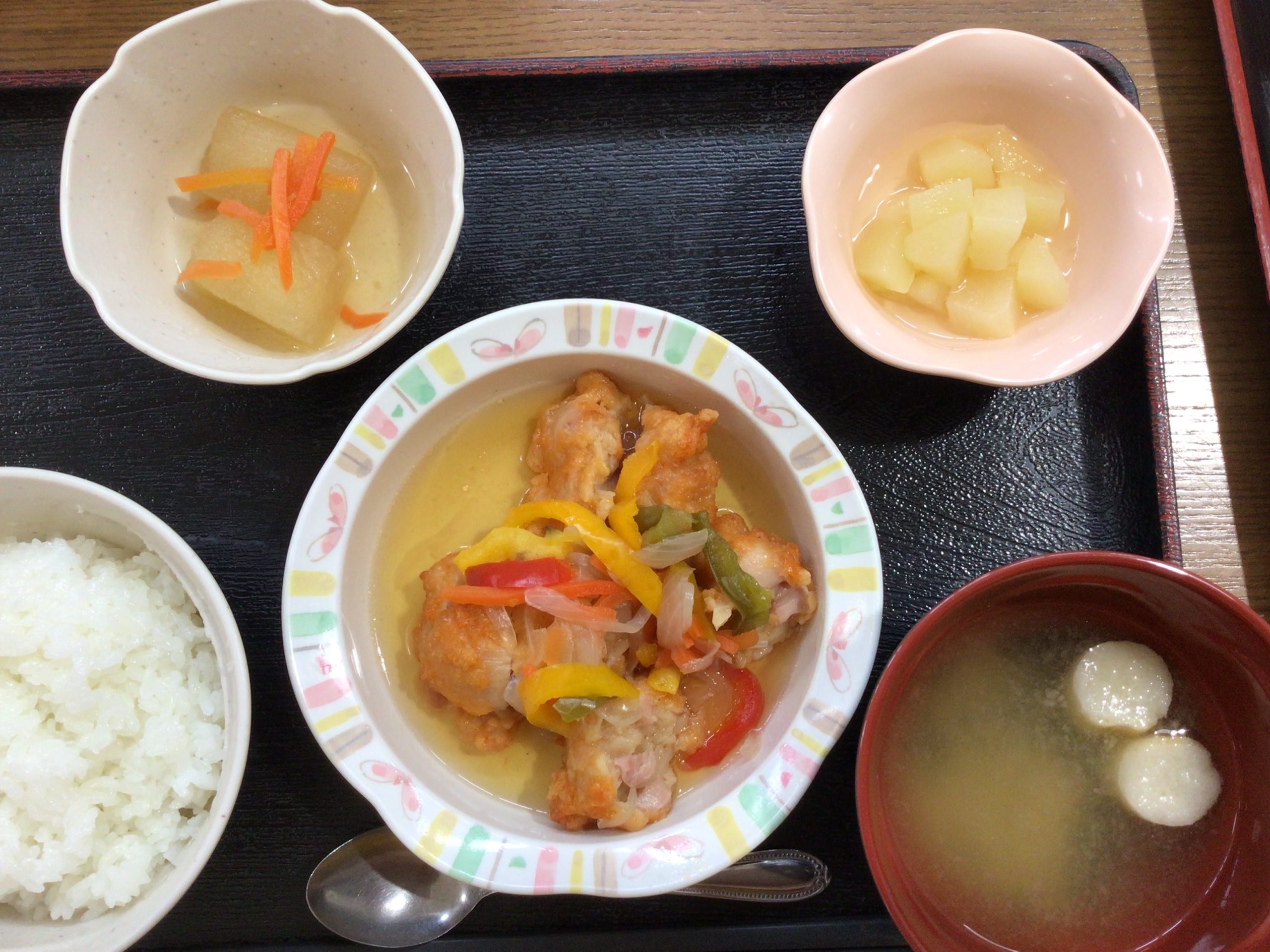 【昼食】 1.ご飯 2.鶏の南蛮漬け 3.冬瓜の煮物 4.フルーツ缶(白桃) 5.みそ汁