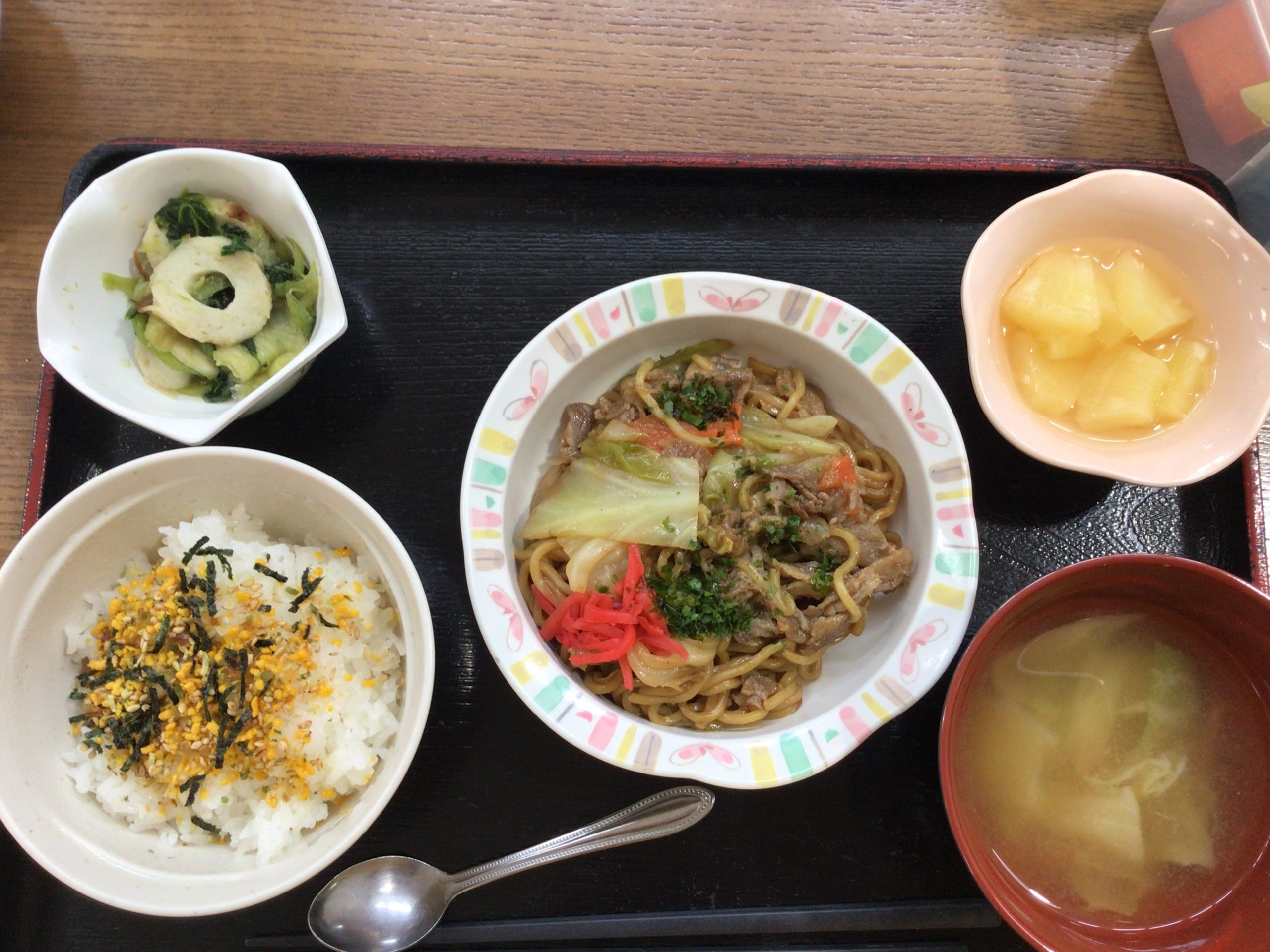 【昼食】 1.ふりかけご飯 2.やきそば 3.青梗菜の生姜醤油和え 4.フルーツ缶(パイン) 5.みそ汁