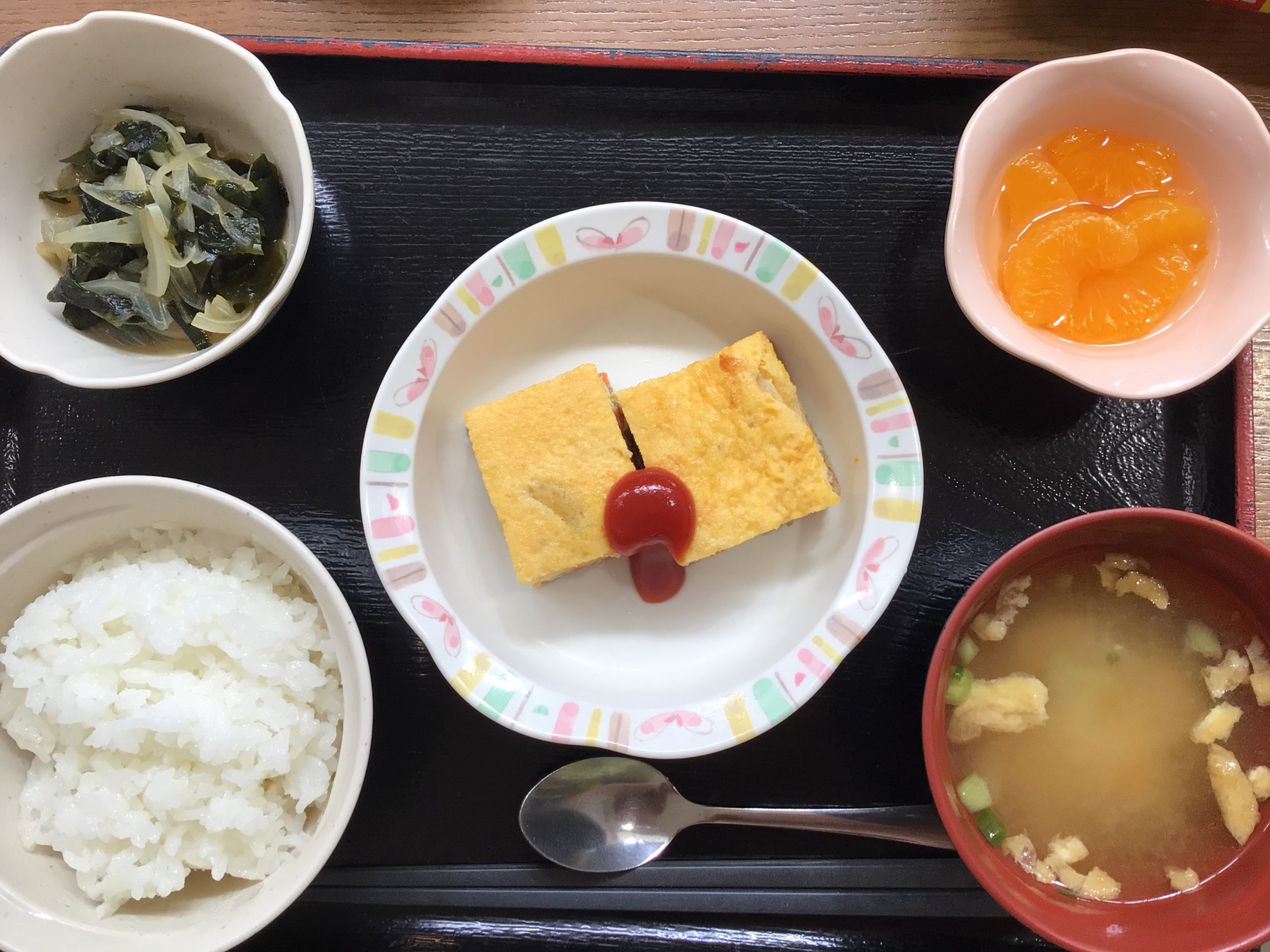 【昼食】 1.ご飯 2.オムレツ 3.玉葱と若布のポン酢和え 4.フルーツ缶(みかん) 5.みそ汁