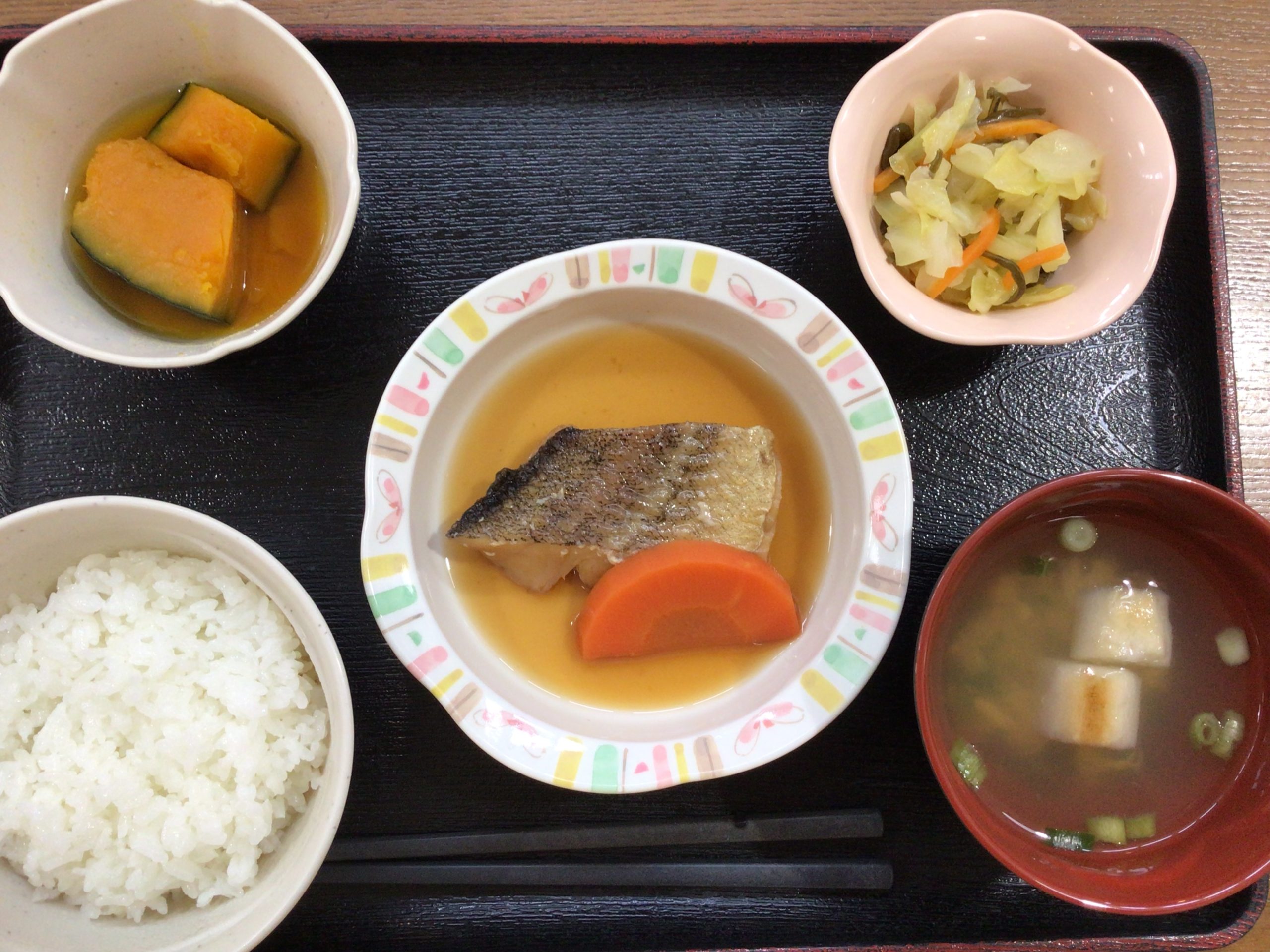 【昼食】 1.ご飯 2.タラの煮魚 3.かぼちゃの含め煮 4.キャベツの塩昆布和え 5.すまし汁