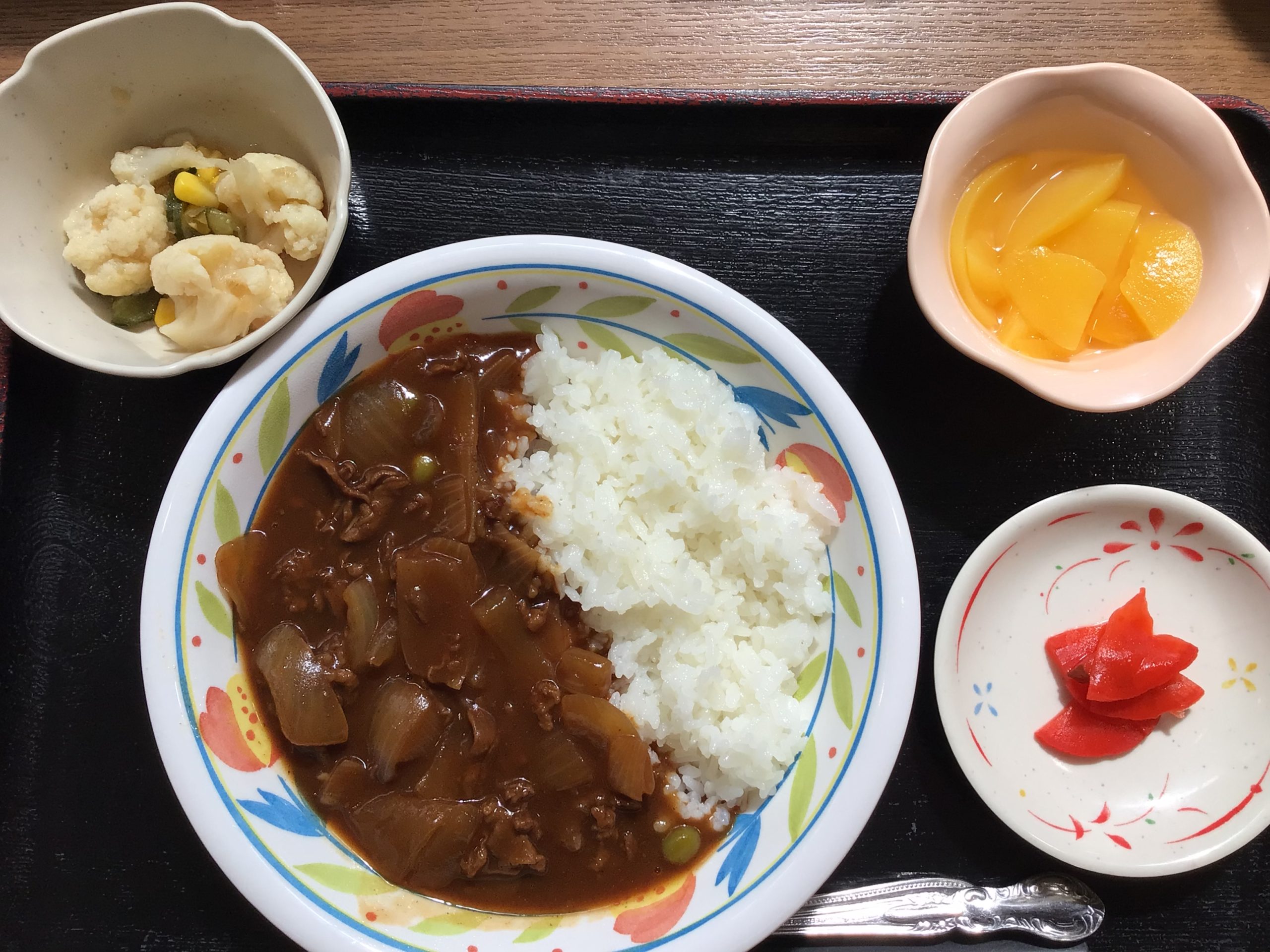 【昼食】 1.ハヤシライス 2.福神漬け 3.カリフラワーのドレッシング和え 4.フルーツ缶(もも)