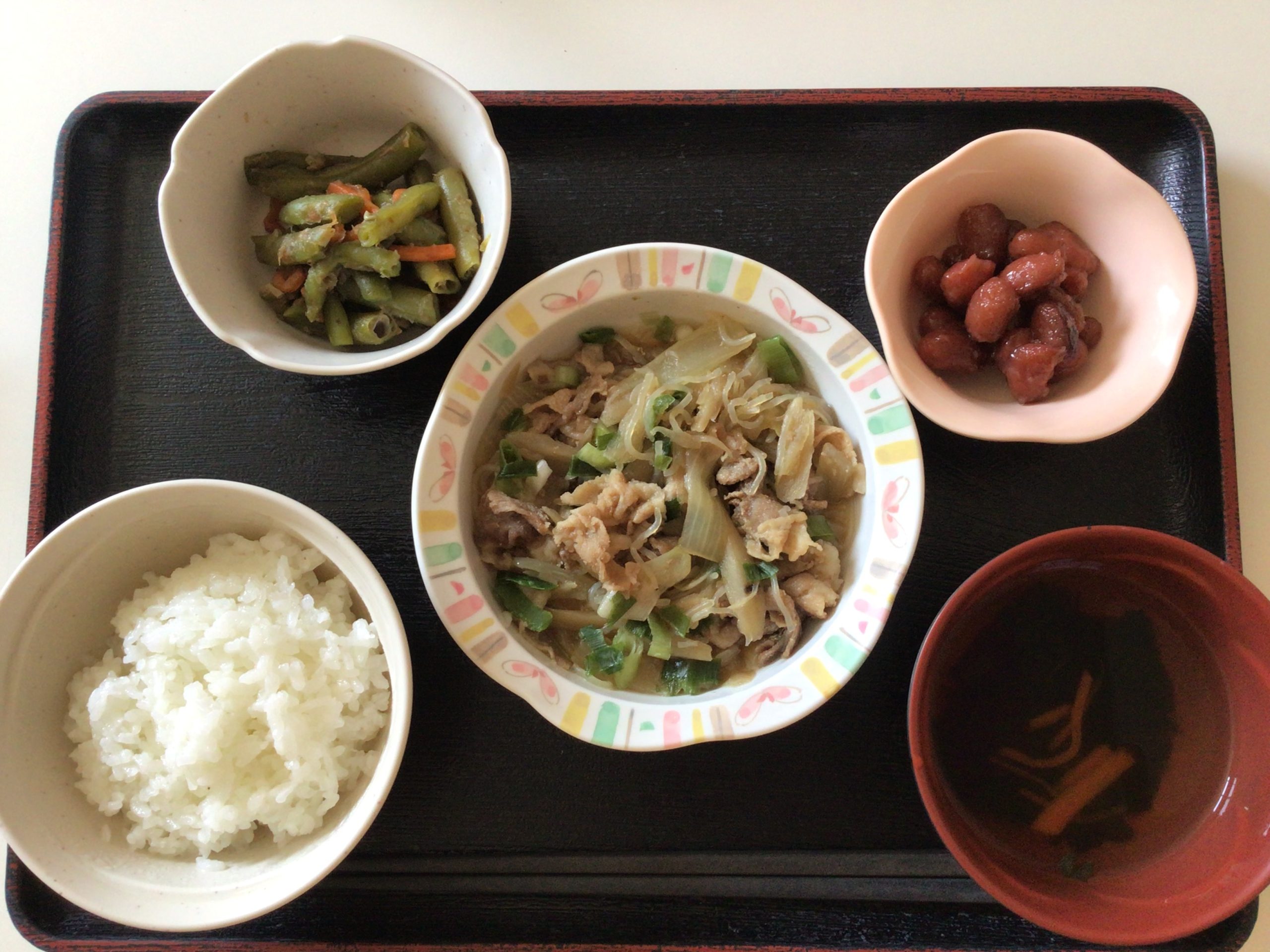 【昼食】 1.ご飯 2.豚肉とごぼうの煮物 3.いんげんのおかか和え 4.金時豆 5.すまし汁