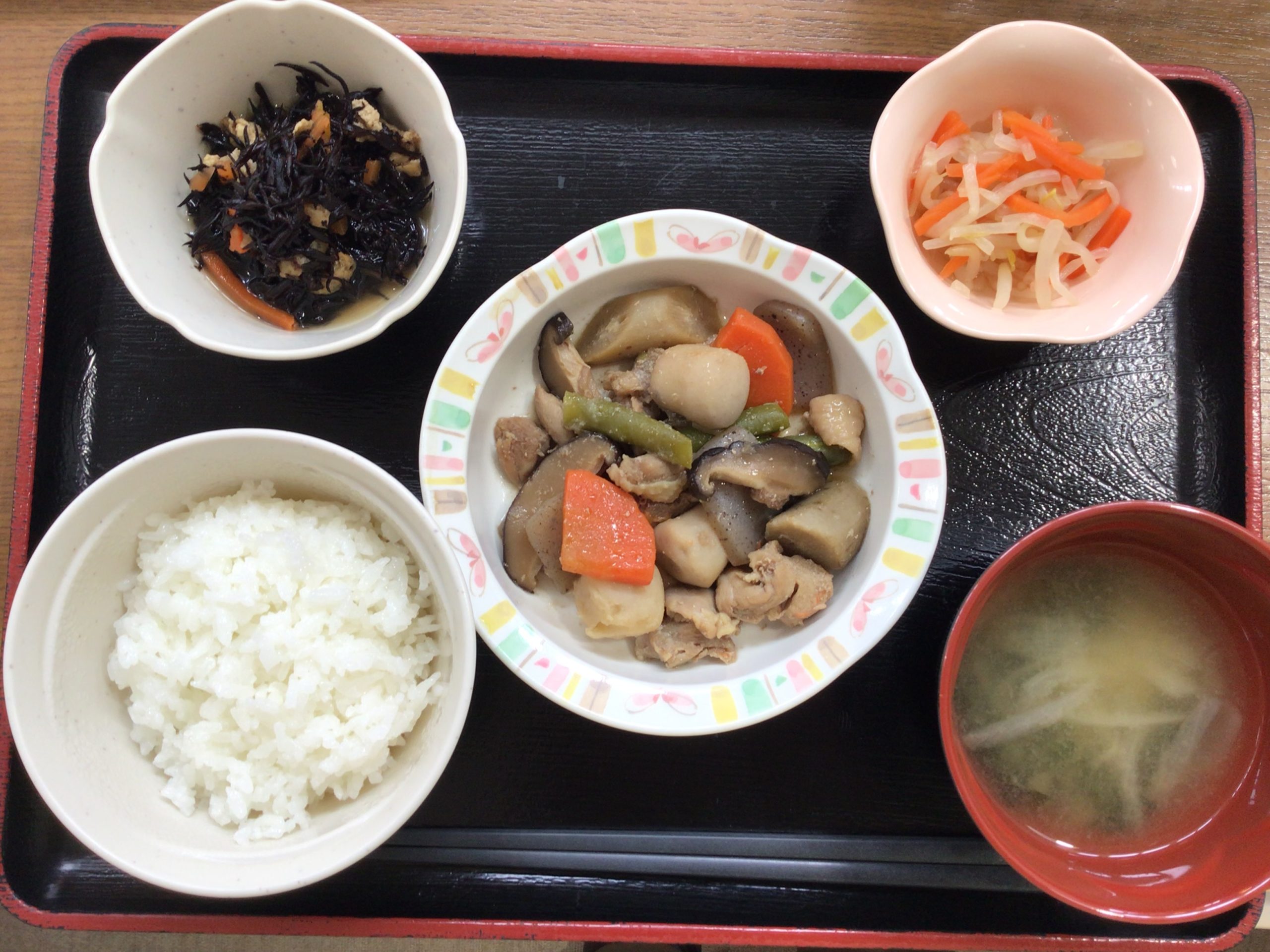【昼食】 1.ご飯 2.炒り鶏 3.もやしの胡麻酢和え 4.ひじき煮 5.みそ汁