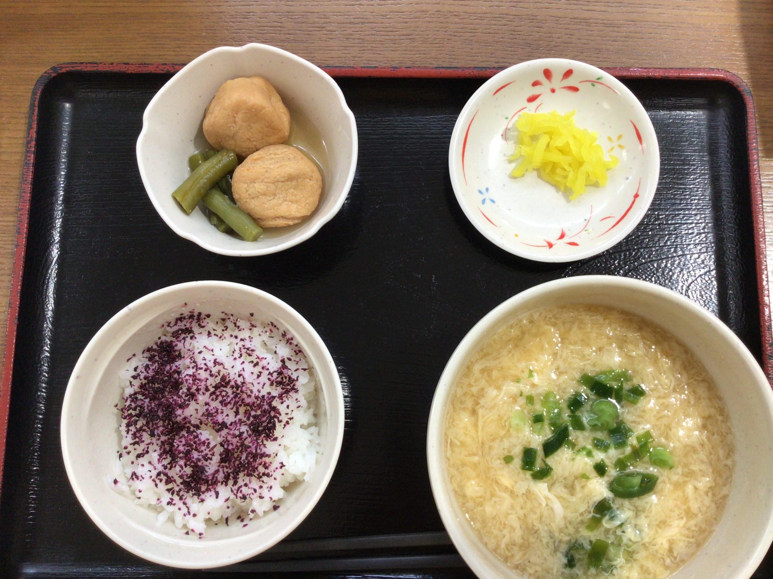 【昼食】 1.ゆかりご飯(小) 2.卵あんかけうどん 3.がんも煮 4.漬物