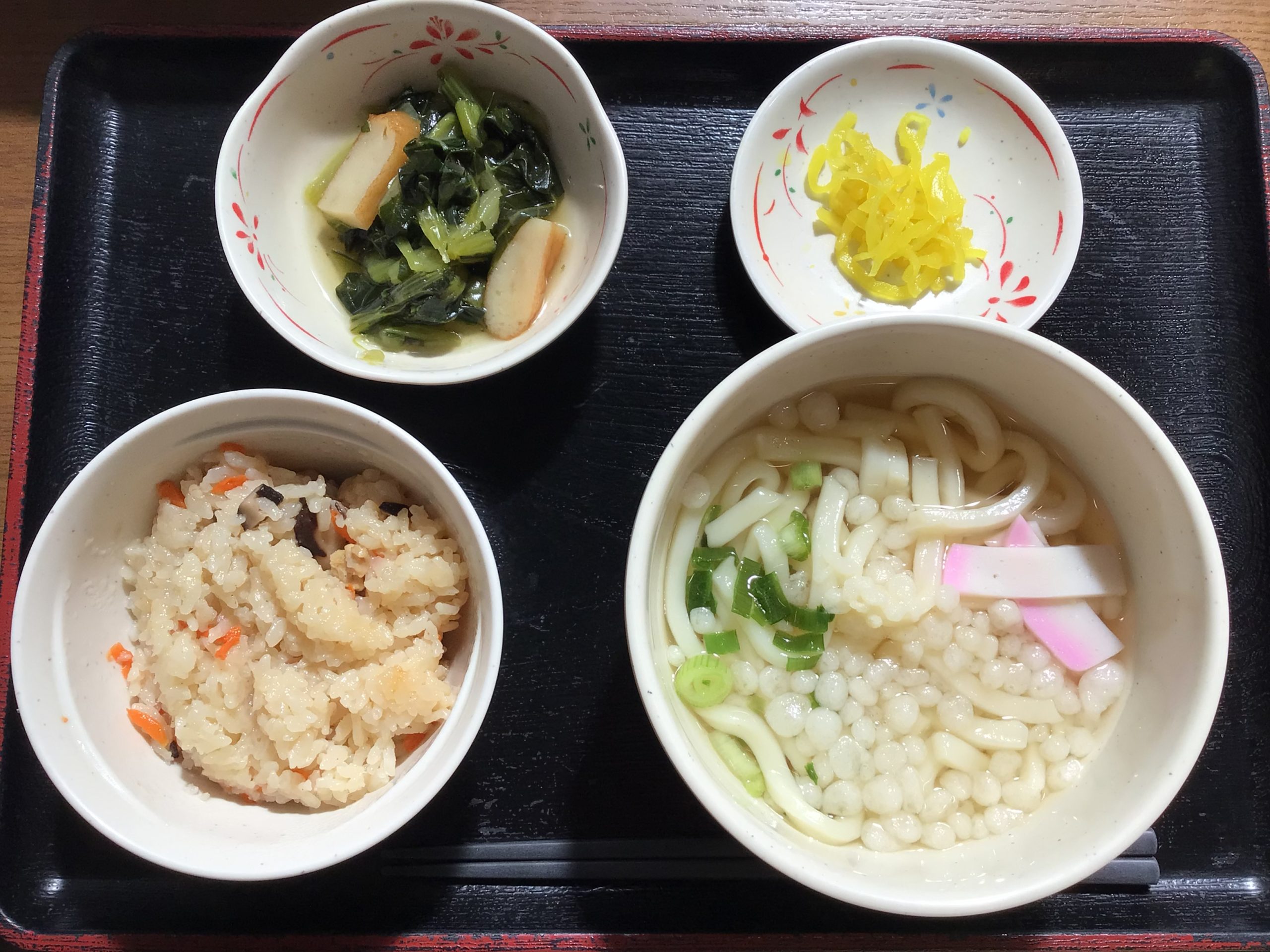 【昼食】 1.炊き込みご飯(小) 2.たぬきうどん 3.小松菜の煮びたし 4.漬物