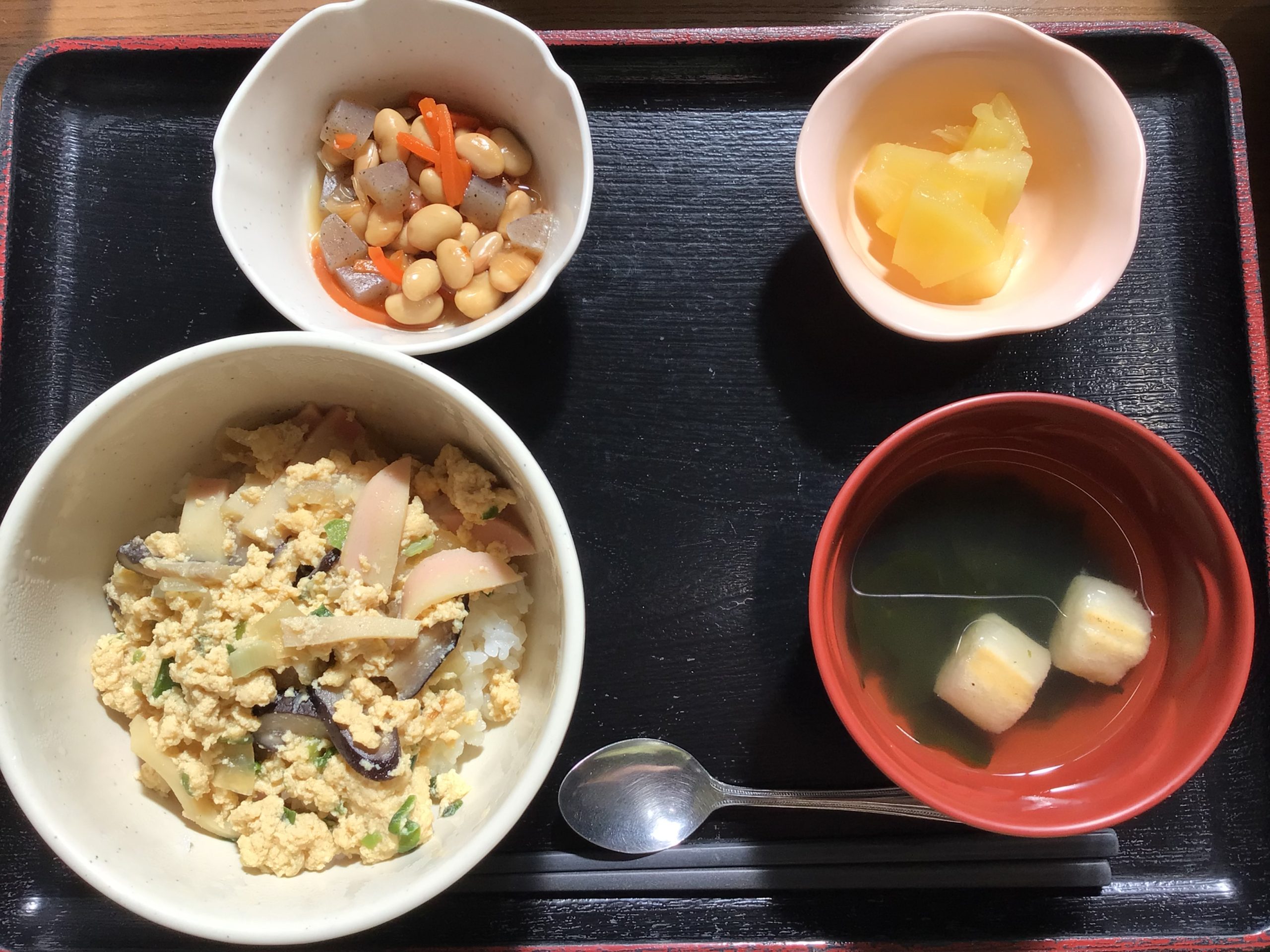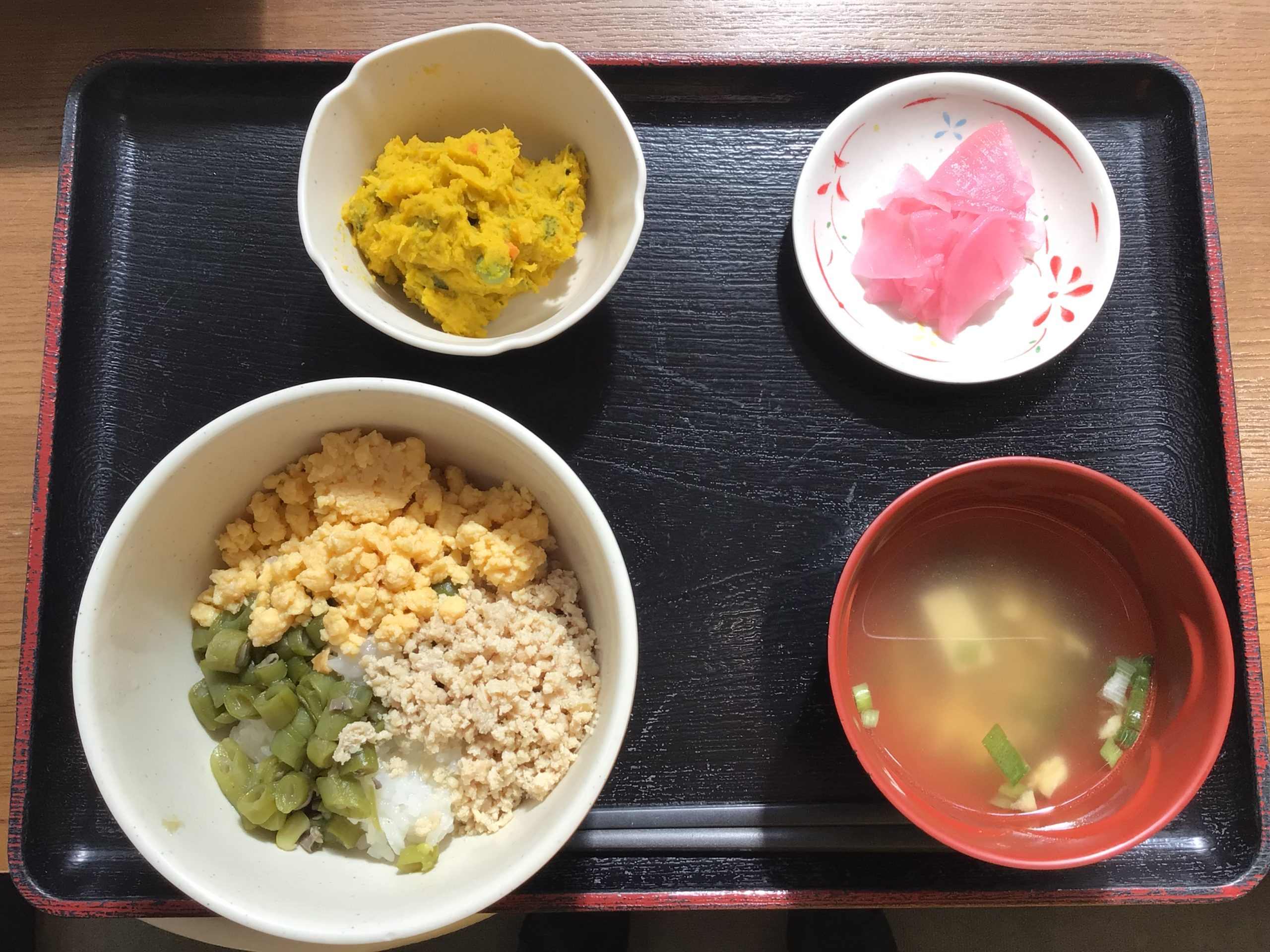 【昼食】 1.三食そぼろ丼 2.かぼちゃサラダ 3.漬物 4.すまし汁