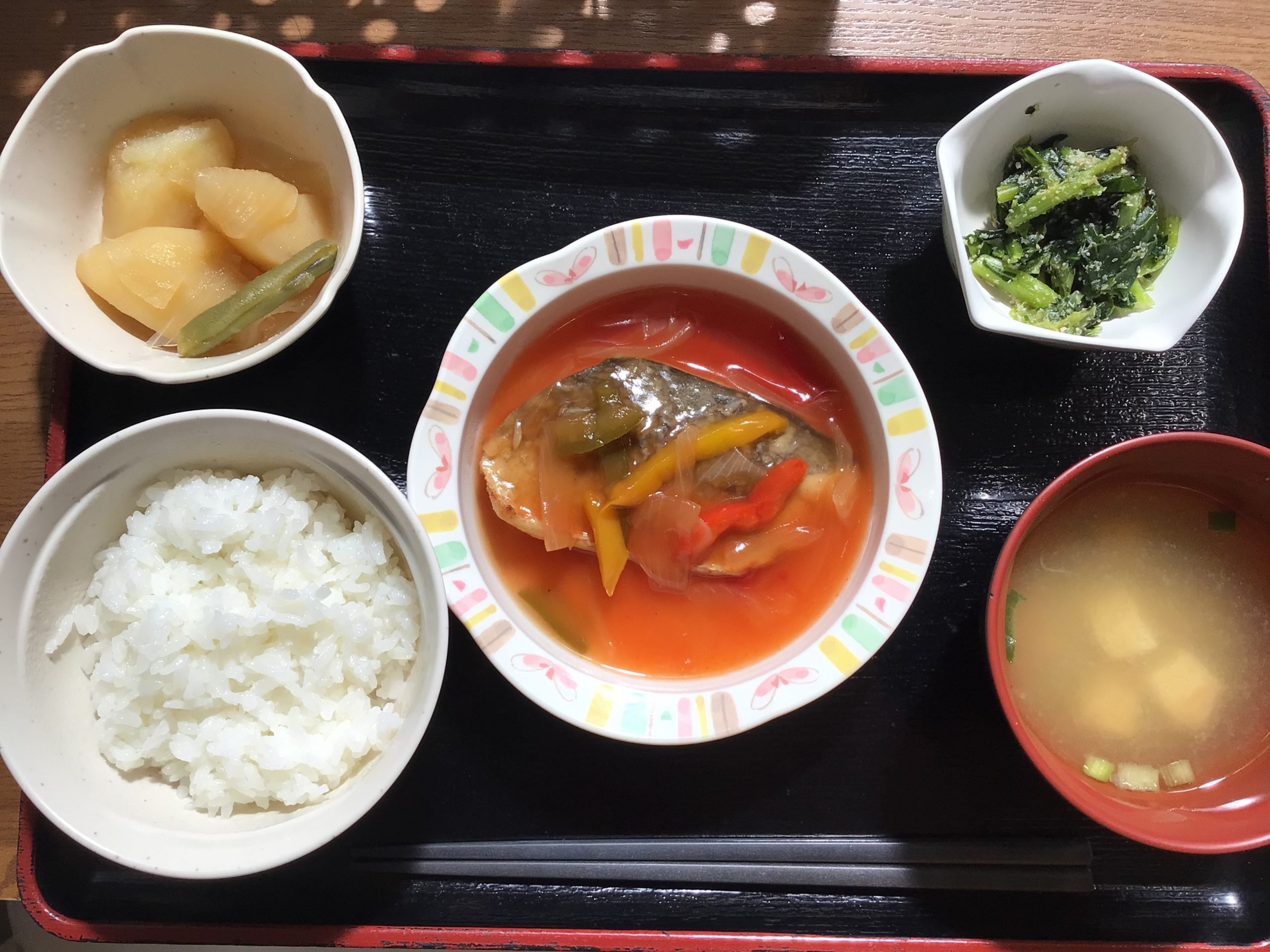 【昼食】 1.ご飯 2.魚の甘酢あんかけ 3.じゃがいもの煮物 4.小松菜ごま和え 5.みそ汁