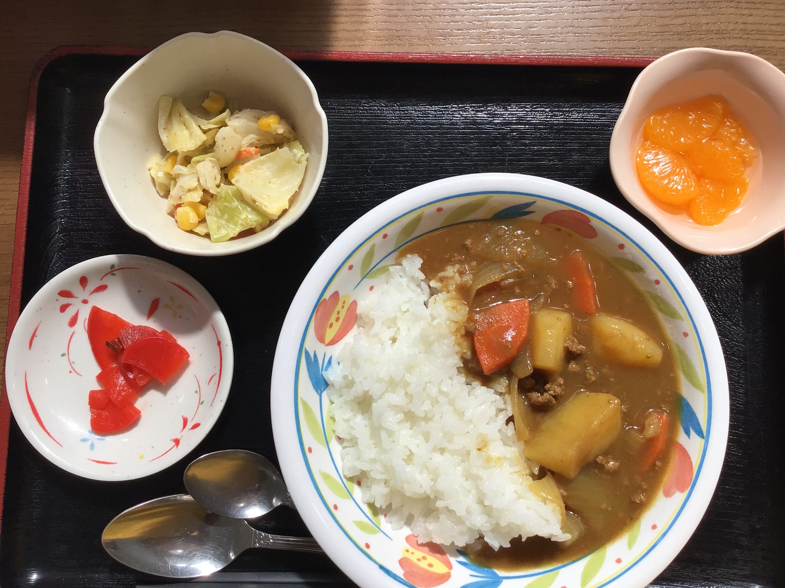 【昼食】 1.カレーライス 2.福神漬け 3.コールスローサラダ 4.フルーツ缶(みかん)