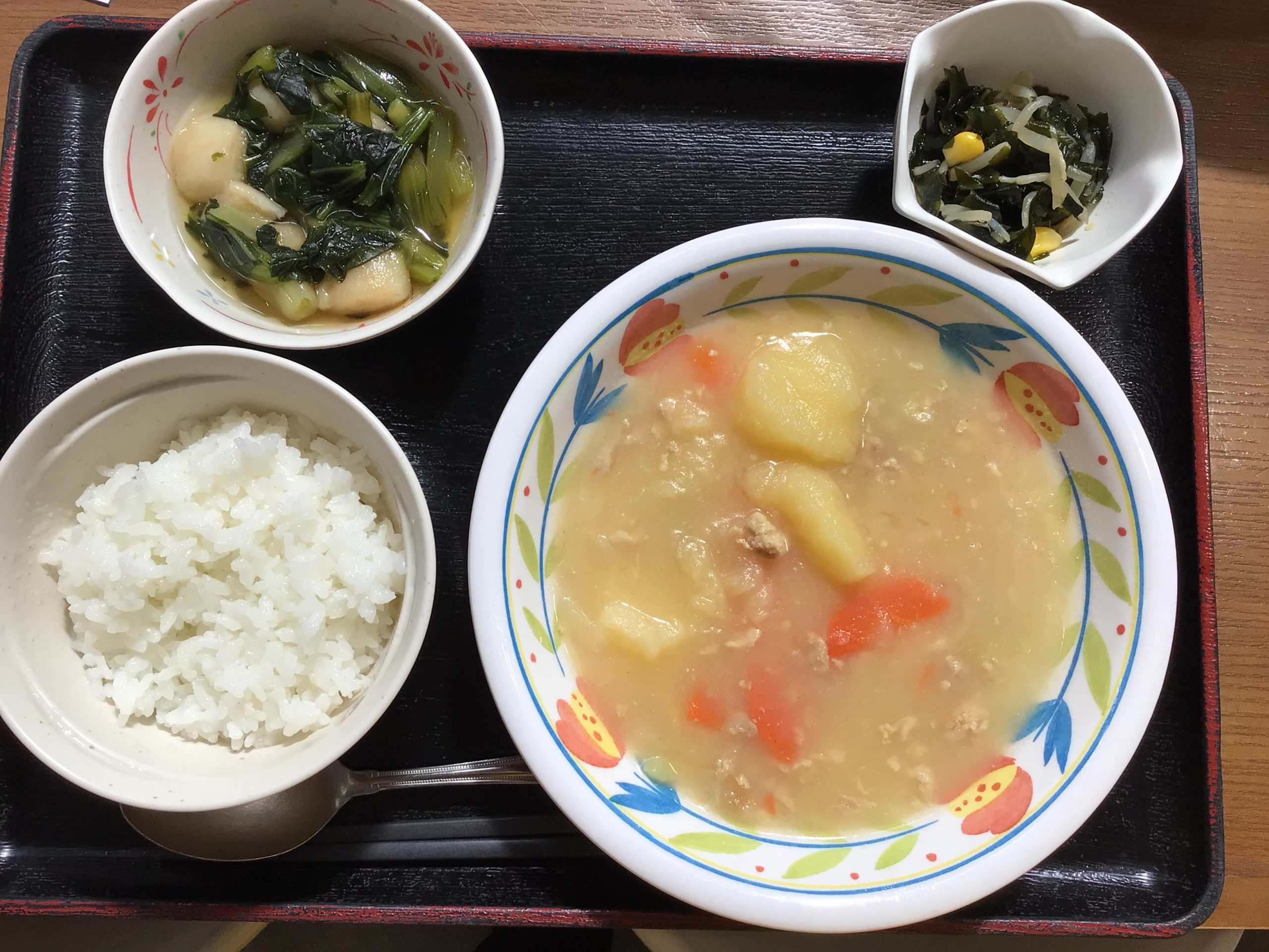【昼食】 1.ご飯 2.クリームシチュー3.麩と小松菜の煮物 4.海藻サラダ
