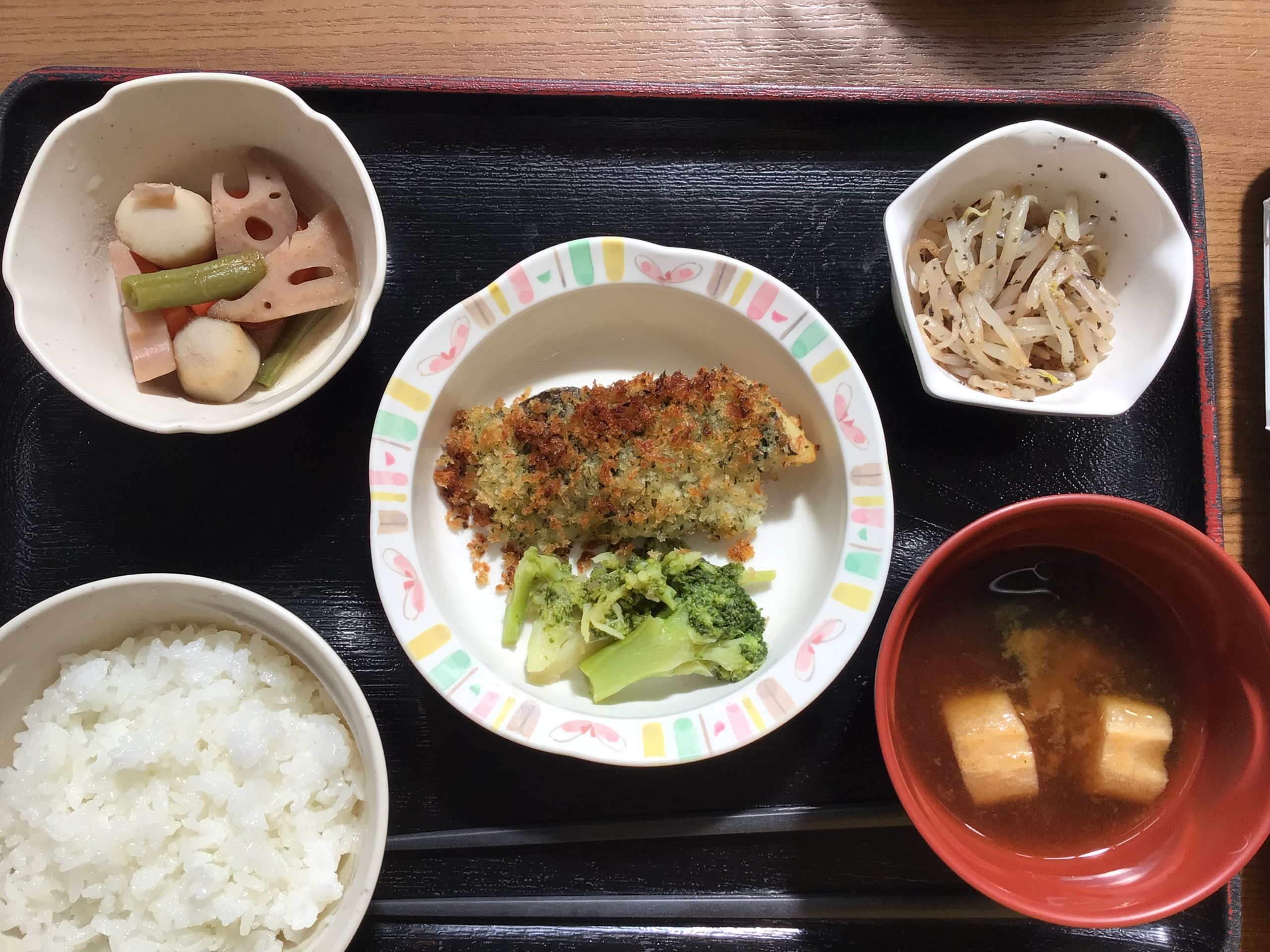 【昼食】 1.ご飯 2.白身魚の香草パン粉焼き(添)ブロッコリー 2.ごった煮 4.もやしのゆかり和え 5.みそ汁