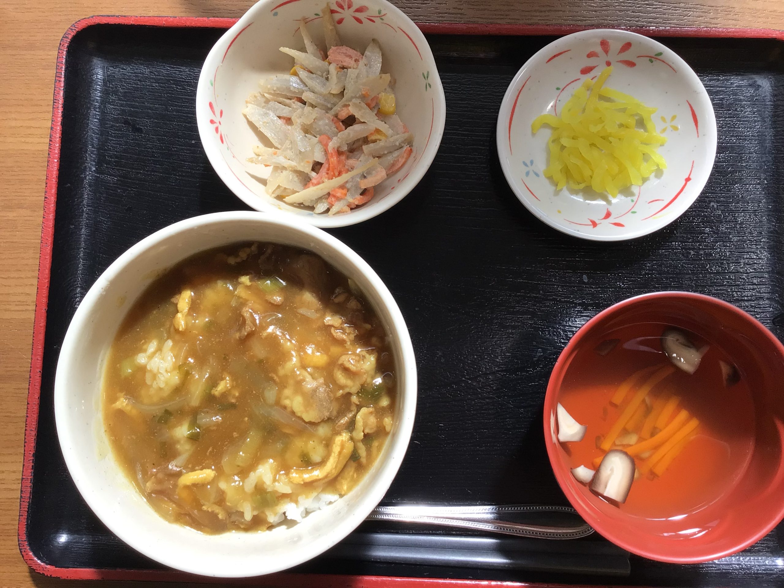 【昼食】 1.カレー丼 2.ごぼうサラダ 3.漬物 4.すまし汁