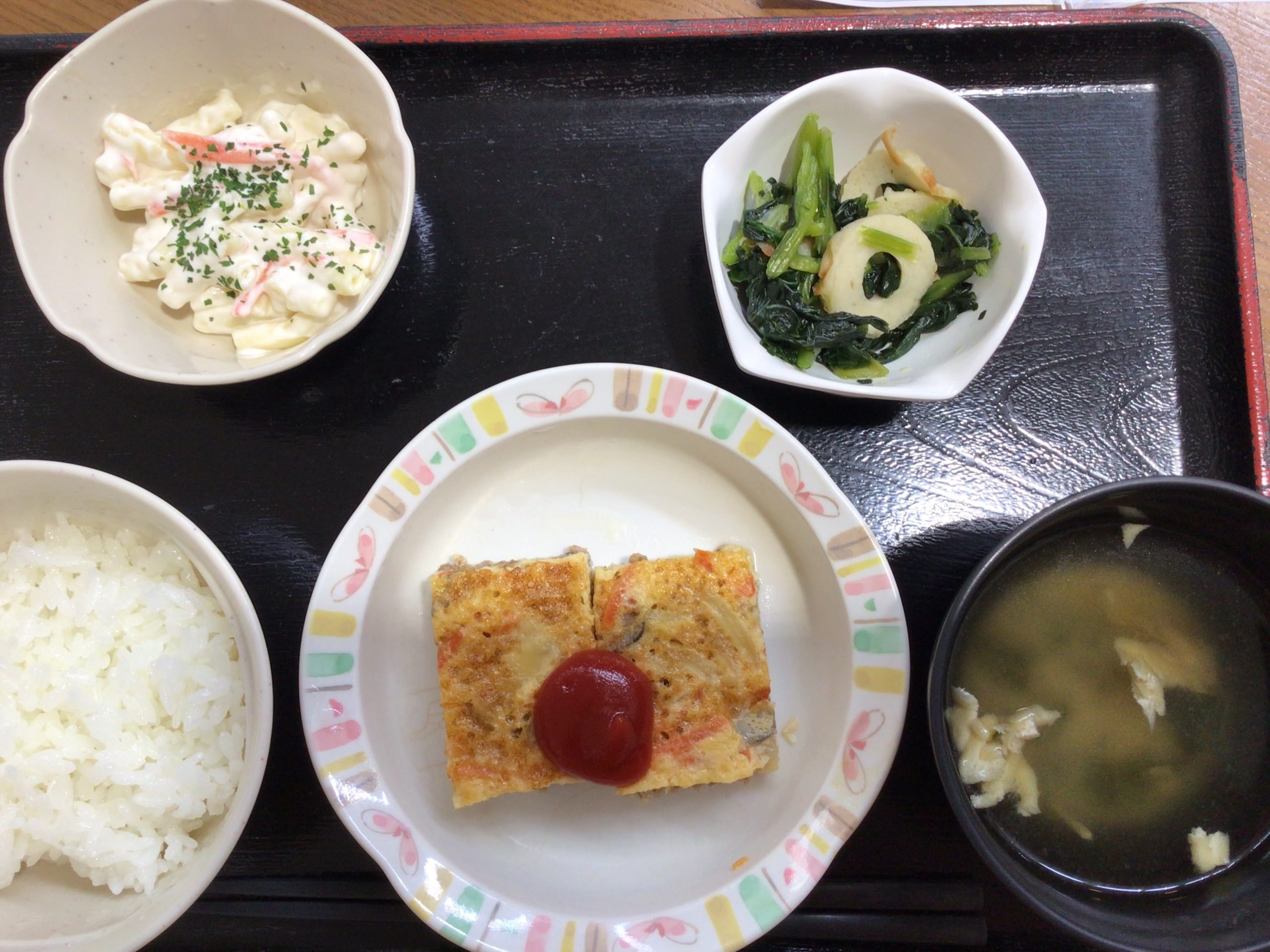 【昼食】 1.ご飯 2.オムレツ 3.小松菜の煮びたし 4.マカロニサラダ 5.みそ汁